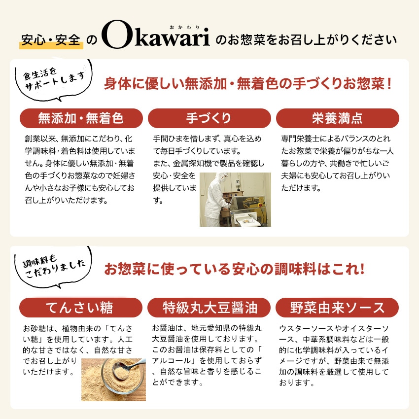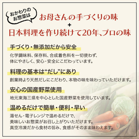 完全手作り・無添加にこだわり、化学調味料・保存料・合成着色料を使用しておりません(一部商品を除く)。 体に優しく、安心・安全にこだわっており、子供から大人まで全ての方におすすめです。お惣菜は、お母さんの手つくりの味のような、優しくて暖かみのある味に仕上げ、素材の本来の味・本物の味を味わっていただけます。 無添加 無着色 化学調味料不使用 合成着色料不使用 安心 安全 天然だし 手作り てづくり 母の味 家庭の味 身体に優しい 身体に良い 自然由来 素材の味
