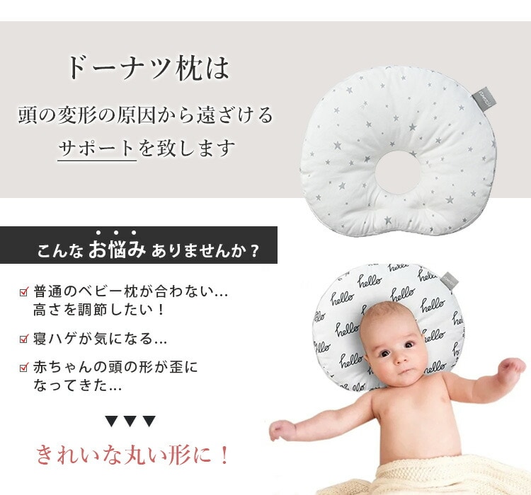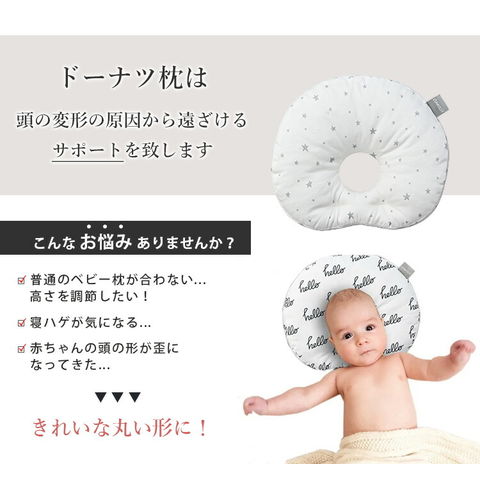 たくさんのお客様からいただいた貴重なご意見をもとにさらに改良を重ねてパワーアップしました! ベビーまくらは向き癖防止、絶壁頭防止、寝ハゲ対策などで重宝されてきました。コロンとした可愛らしいカタチとデザインをそなえながら、赤ちゃんの頭の絶壁防止に役立ちます。 高さ調節ができ、向き癖の改善をサポート。枕の中綿はテイジンウォシュロンで軽くてふっくらとしたクッション性を発揮。通気性抜群で汗もしっかり吸収します。手洗いできるので、清潔に保てます。 ※本ページは、「インサート式ドーナツ枕」+「新生児まくら」のセット販売ページです。 |