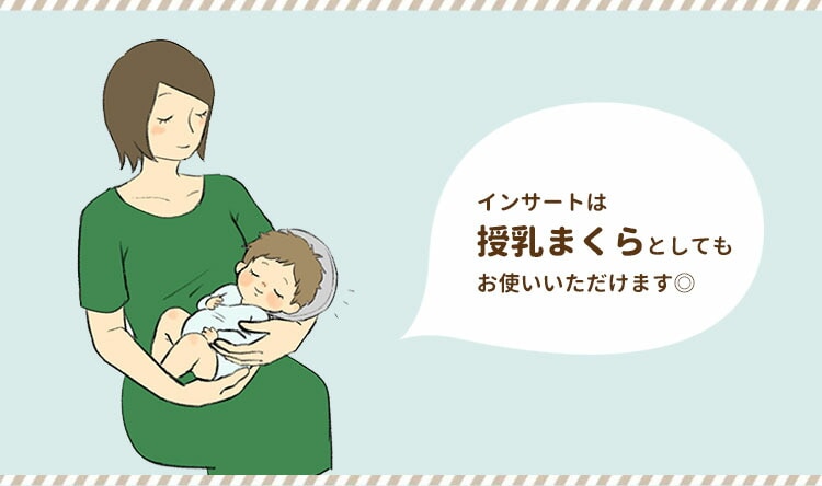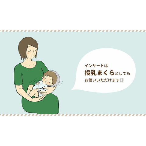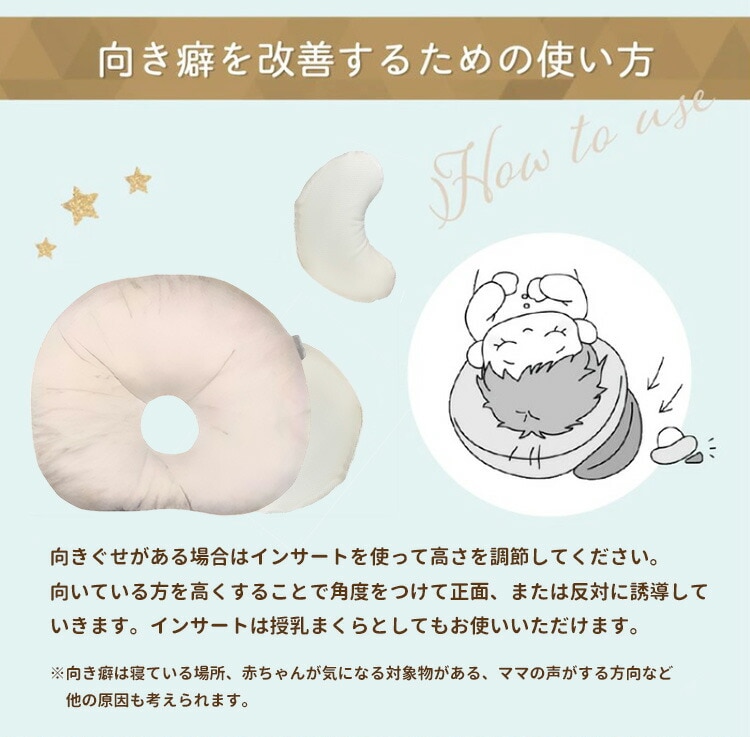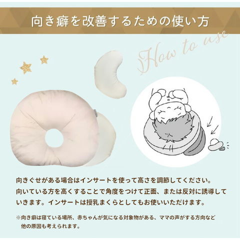 向きぐせがある場合はインサートを使って高さを調節してください。向いている方を高くすることで角度をつけて正面、または反対に誘導していきます。インサートは授乳まくらとしてもお使いいただけます。 ※向き癖は寝ている場所、赤ちゃんが気になる対象物がある、ママの声がする方向など他の原因も考えられます。 |