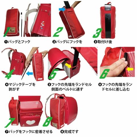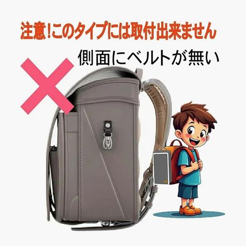 ※ランドセル側面部のベルトに取付フックを差し込むことによりバッグとランドセルがしっかり密着するように設計されておりますので、側面部にベルトが無いランドセルは非対応です。 ※また、イオンで販売されておりますランドセル【かるすぽシリーズ】は側面にサイドベルトが付いていないので非対応です。 |