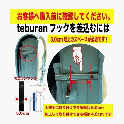 ランドセルへ装着する際は、てぶランフックを使用し装着します。てぶランフックの素材はPP(ポリプロピレン材)を使用し弊社独自の安全幅としており、安全の基本幅は、5.1cmです。 てぶランの取付け、取外しについては低学年のお子様でも取り付けられるようにフックの改良をしましたが、1年生のお子様ができない場合、保護者の方のお手伝いをお願いいたします。 ※下記ランドセルにはご使用いただけません。 ・前締めベルトの側面幅が5.1cm以下のランドセル ・側面の前締めベルトが中心部までしかないランドセル ・ランドセルの側面の厚みが6mm以上あるランドセル |