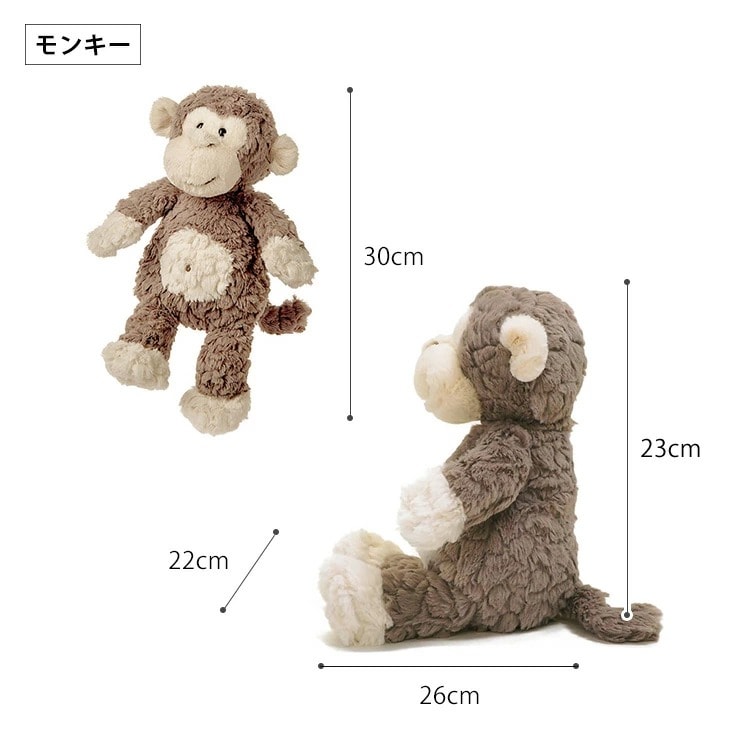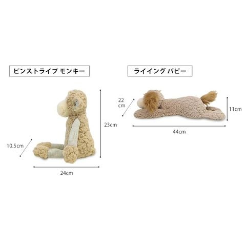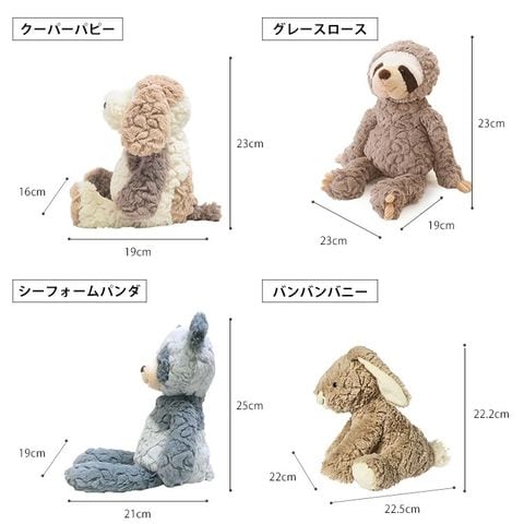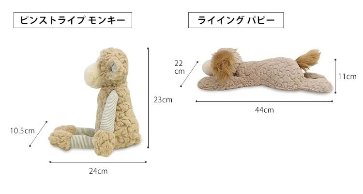 | サイズ(約) | 【ベア】 座った状態:W36×H28×D27.5cm 足をのばした状態:H43cm 【グレーモンキー】 W22×H23×D26cm 足をのばした状態:H30cm 【クーパーパピー】 座った状態:W16×H23×D19cm 【グレースロース】 座った状態:W23×H23×D19cm 【シーフォームパンダ】 座った状態:W19×H25×D21cm 【バンバンバニー】 座った状態:W22×H22.2×D22.5cm 【ピンストライプ モンキー】 W10.5×H23×D24cm 【ライイング パピー】 W22×H11×D44cm |
