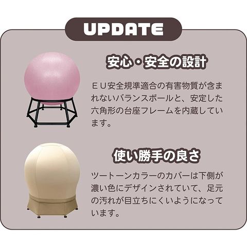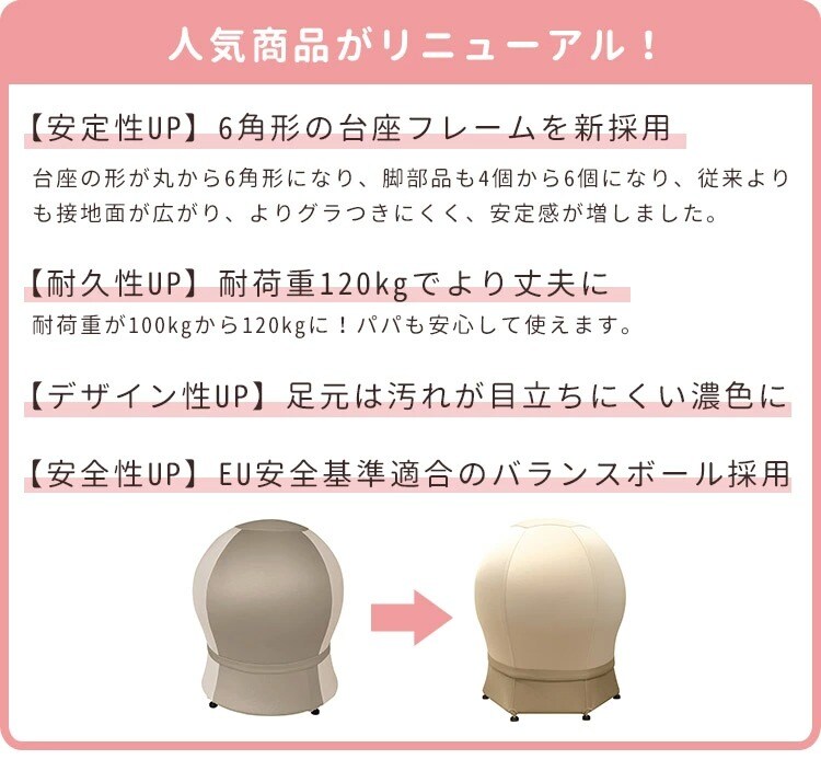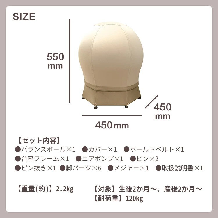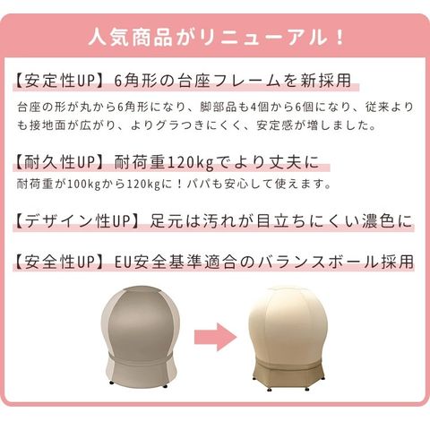 【安定性UP】6角形の台座フレームを新採用 従来よりも接地面が広がり、よりグラつきにくく、安定感が増しました。揺れている時も、エクササイズしている時も、しっかりサポートします。 【耐久性UP】耐荷重120kgでより丈夫に しっかりとした構造で、大人が座っても安心。パパも一緒に使えて、家族みんなで長く愛用できます。 【デザイン性UP】足元は汚れが目立ちにくい濃色デザイン フレームの下部を濃い色にすることで、床の傷やほこりなどが目立ちにくい、実用的でおしゃれなデザインになりました。 【安全性UP】EU安全基準適合のバランスボール 有害物質に関する厳しい試験をクリアした、高品質で安全なバランスボールを採用。赤ちゃんと触れ合うアイテムとして、安心してお使いいただけます。 |