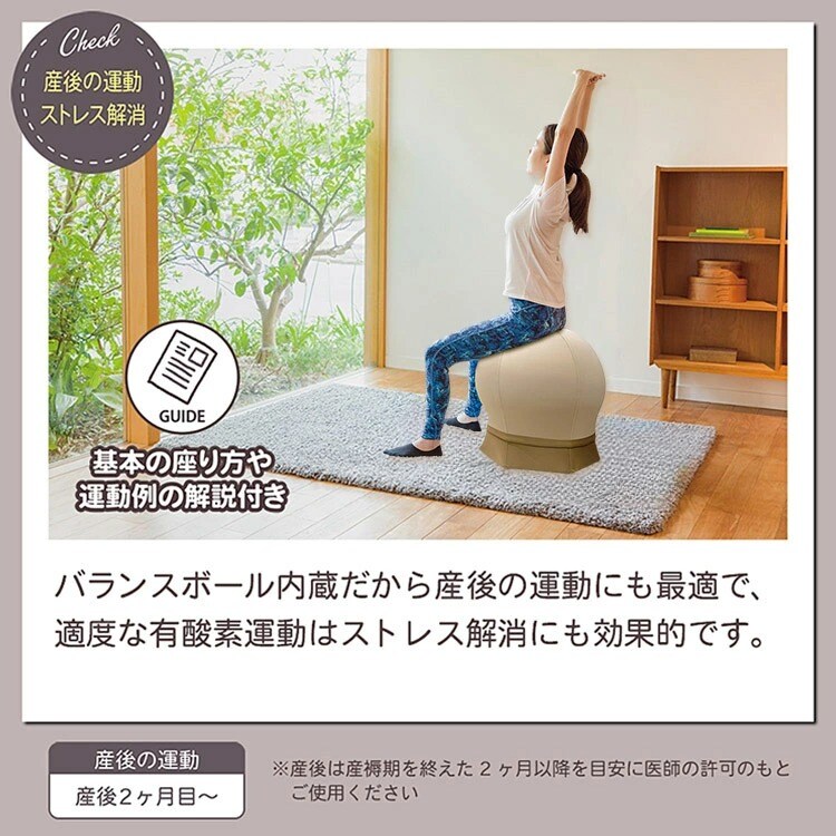 内蔵された高品質なバランスボールが、無理のない適度な有酸素運動を実現。産後の体型戻しや体力づくり、育児の合間のストレス解消に最適です。わざわざエクササイズの時間を確保しなくても、日常の中で自然と運動ができます。