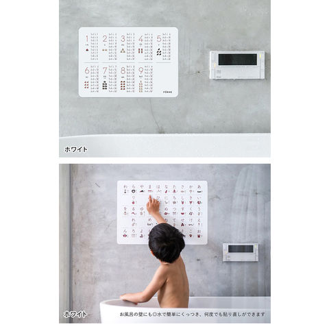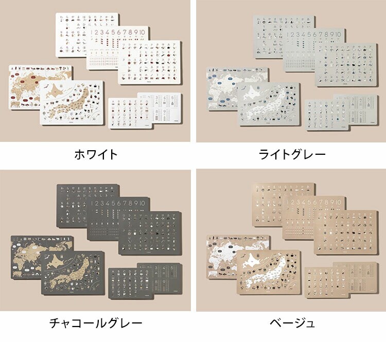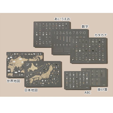 | サイズ | 数字・あいうえお・カタカナ・日本地図・世界地図:B3(36.4cm×51.5cm) ABC、掛け算:B4(25.7cm×36.4cm) |
