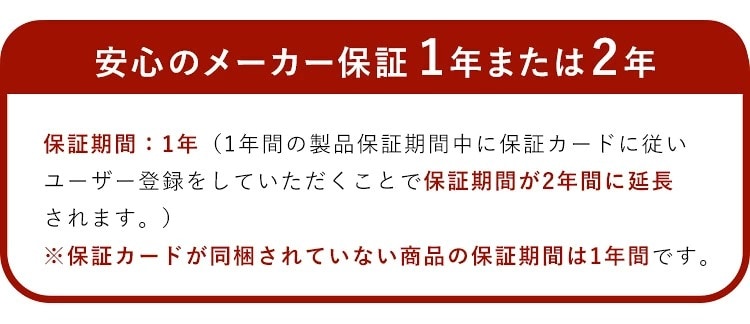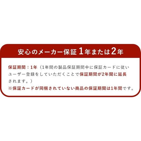| 製品保証 | ■保証期間:1年(1年間の製品保証期間中に保証カードに従いユーザー登録をしていただくことで保証期間が2年間に延長されます。)※保証カードが同梱されていない商品の保証期間は1年間です |