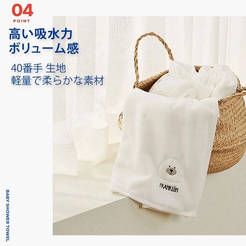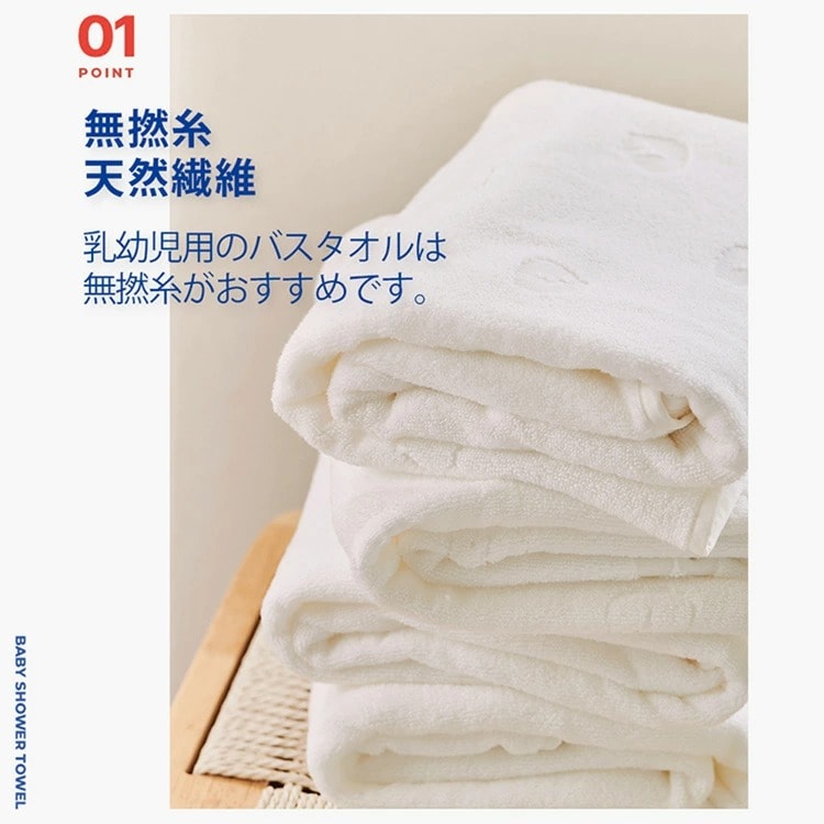 | 40番手の無撚糸で作られており、柔らかい肌触りと高い吸水力があります。お風呂上りだけでなく赤ちゃんの寝汗を拭くためにも利用できます。 |