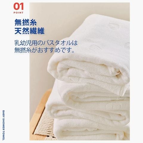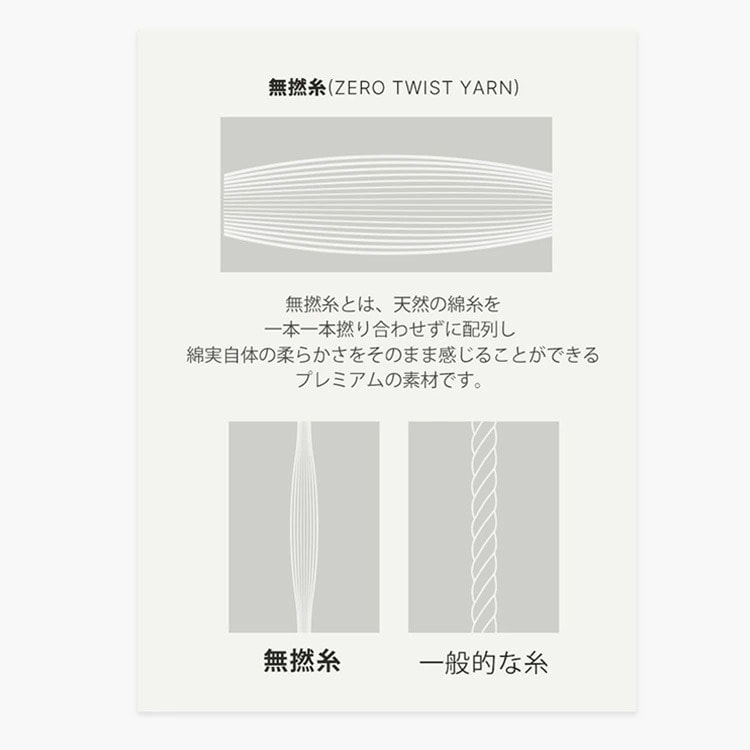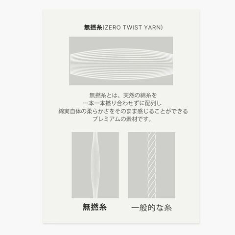 | 一般的なタオルは糸を撚(よ)ってタオルを作りますが、無撚糸(むねんし)は糸をほとんど撚らない無撚糸(むねんし)では、繊維の間にたくさんの空気を含み、ふわっととした優しい感触で赤ちゃんを包み込むことができます。 |