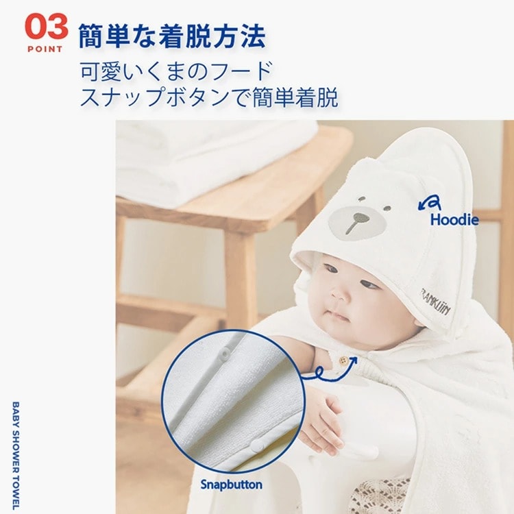 | くまさんのフードをかぶせてあげて、スナップボタンでパッチと止めるだけの簡単着衣。お風呂上りの赤ちゃんにサっと着させてあげられます。 |