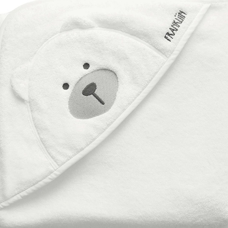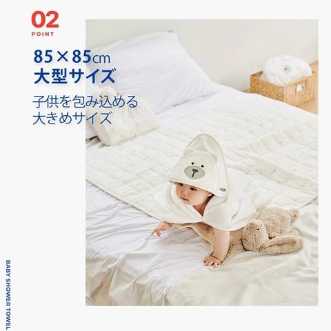 | フードのクマのデザインがとってもかわいい、慌ただしいお風呂上りにおすすめの乳幼児用バスタオル。3歳頃まで使えます。 |