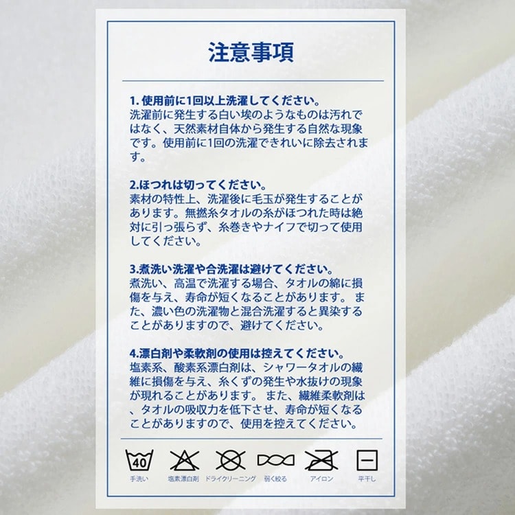 | 1. 本来の用途以外には使用しないでください。 2. 使用前に1回以上洗濯してください。 3.ほつれは切ってください。 素材の特性上、洗濯後に毛玉が発生することがあります。無撚糸タオルの糸がほつれた時は絶対に引っ張らず、糸巻きやナイフで切って使用してください。 4.煮洗い洗濯や混合洗濯は避けてください。 煮洗い、高温で洗濯する場合、タオルの綿に損傷を与え、寿命が短くなることがあります。 また、濃い色の洗濯物と混合洗濯すると異染することがありますので、避けてください。 4.漂白剤や柔軟剤の使用は控えてください。 塩素系、酸素系漂白剤は、シャワータオルの繊維に損傷を与え、糸くずの発生や水抜けの現象が現れることがあります。 また、繊維柔軟剤は、タオルの吸収力を低下させ、寿命が短くなることがありますので、使用を控えてください。 | |