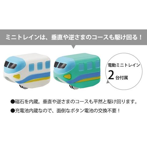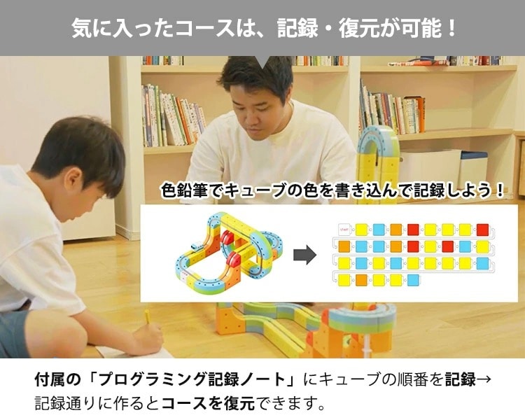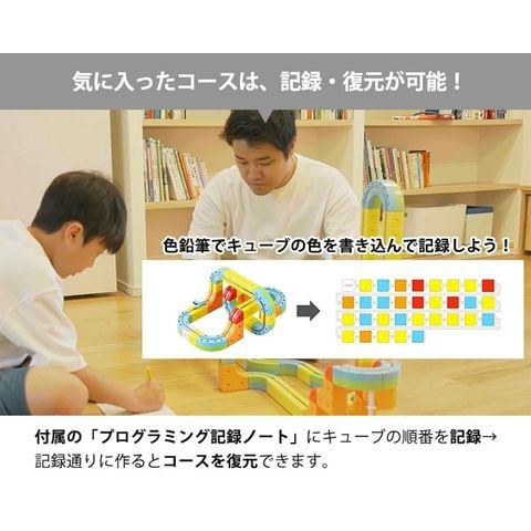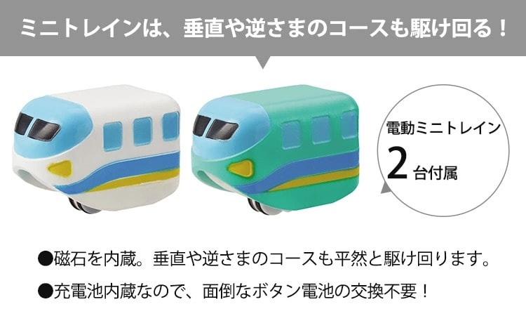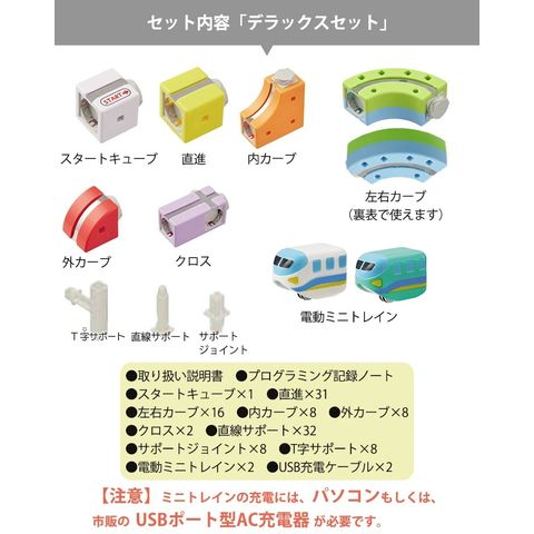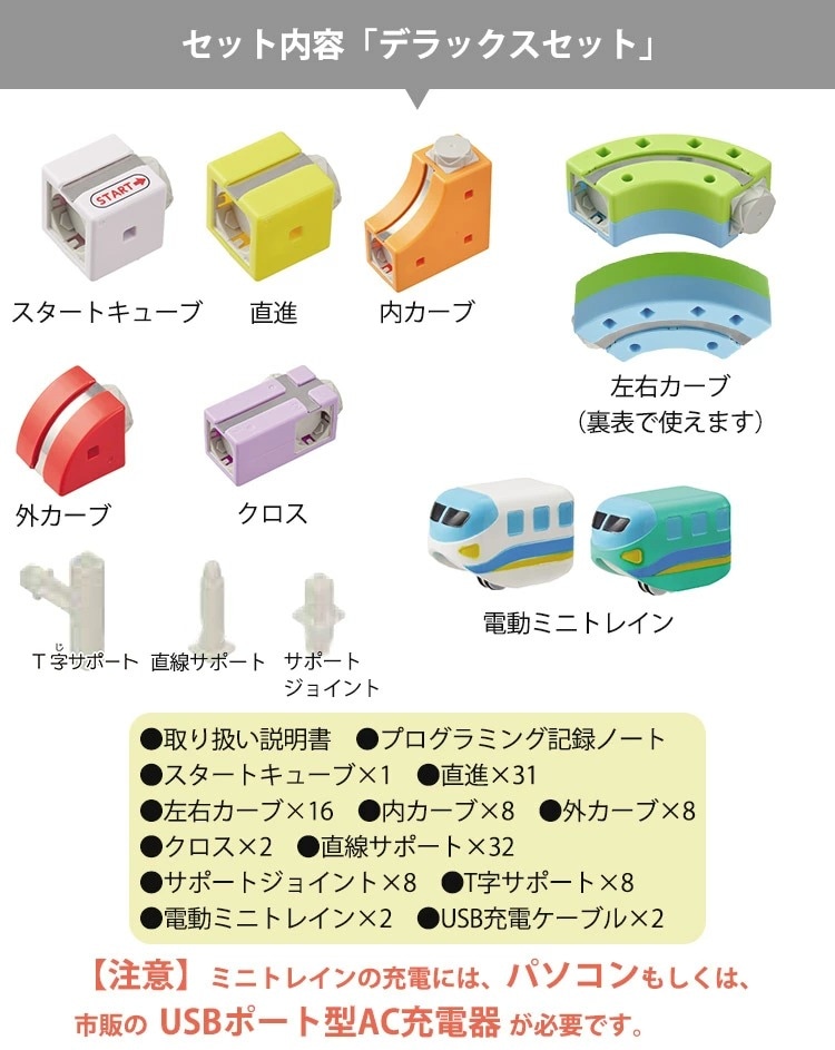 | セット内容・構成品 | ・取り扱い説明書 ・プログラミング記録ノート ・スタートキューブ×1 ・直進×31 ・左右カーブ×16 ・内カーブ×8 ・外カーブ×8 ・クロス×2 ・直線サポート×32 ・サポートジョイント×8 ・T字サポート×8 ・電動ミニトレイン×2 ・USB充電ケーブル×2 |