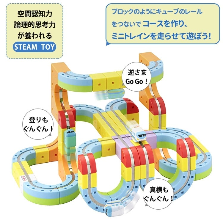 レールキューブは、ブロックのようにキューブのレールをつないでコースを作り、ミニトレインを走らせてあそぶおもちゃです。 ■コースは前にだけではなく、上にのぼったり、宙返りをさせたりしながら繋いでいくことができます。 ■ミニトレインはカベや逆さまのコースでも自由自在に走ります。 ■付属のサポートパーツで補強をすると、空中にコースが作れます。 ■楽しみながら「考えだす力」や「物の向きや場所を正しく理解する力」をのばすことができます。 ■気に入ったコースは、専用のノートに記録・再現することも可能。 ■安心安全設計 |