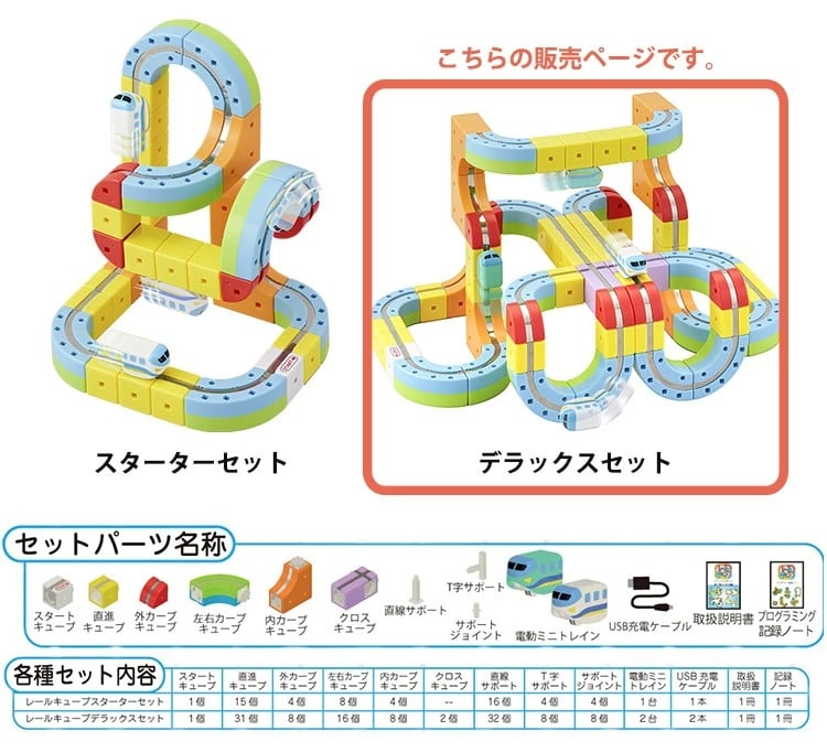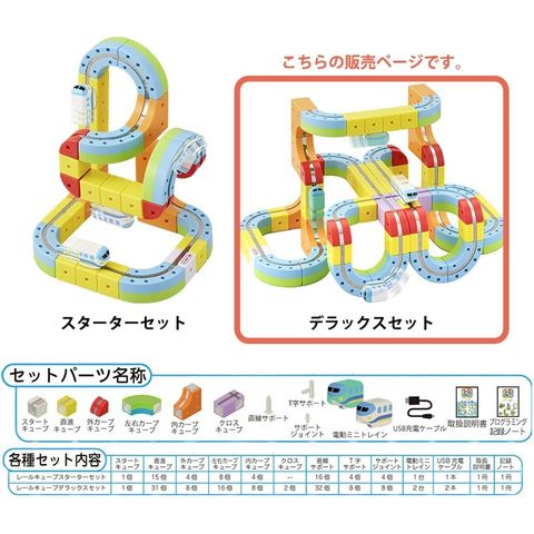 レールキューブには、 ●スターターセット ●デラックスセット の2種類がございます。 こちらは、「デラックスセット」の販売ページです。 |