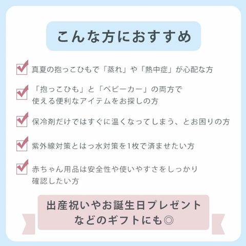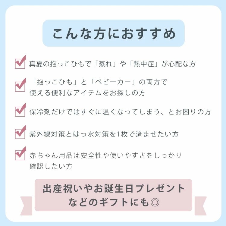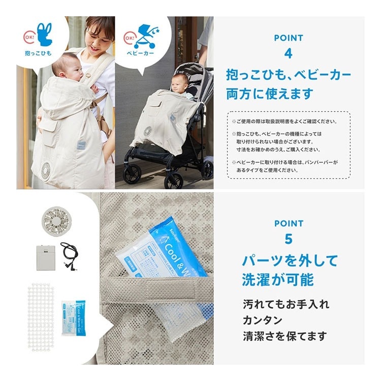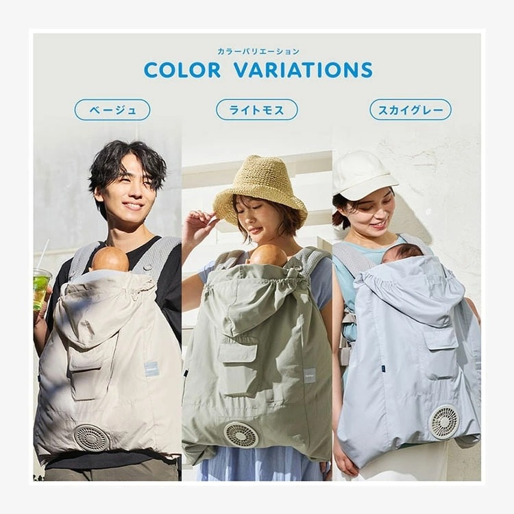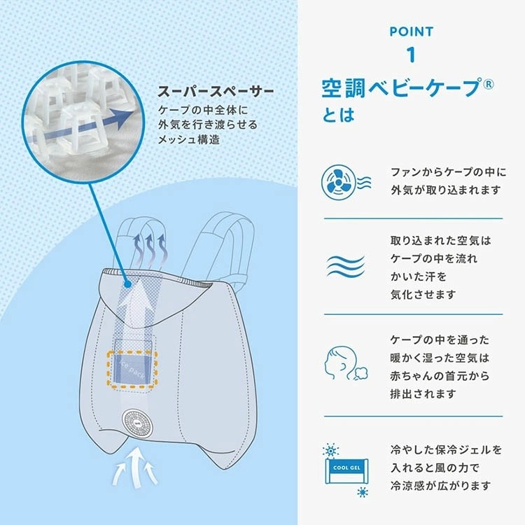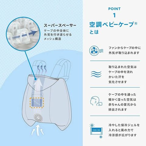 | 猛暑の中での抱っこひもやベビーカー、赤ちゃんとの密着で熱がこもるのが心配ですよね。「空調ベビーケープ」は、小型ファンでケープの中に外気を取り込み、汗を蒸発させる気化熱を利用して冷やす、革新的なベビーケープです。 |