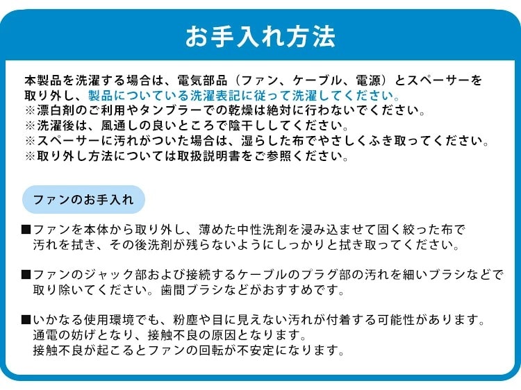 | 素材・成分 | 本体:ポリエステル 100%、メッシュ部分:ポリエステル 100%、スーパースペーサー:ポリエチレン※スーパースペーサーは株式会社セフト研究所により開発された技術です。 |