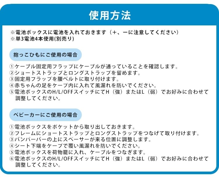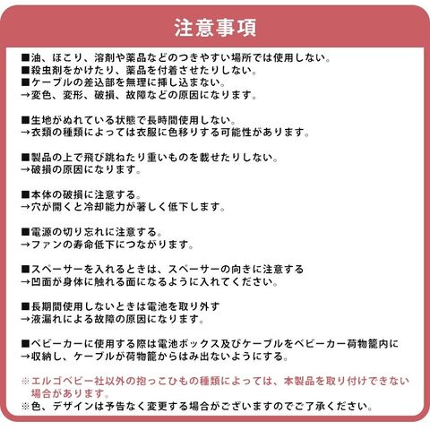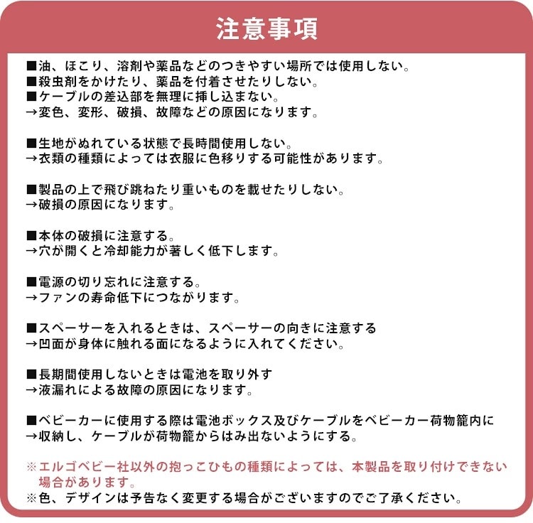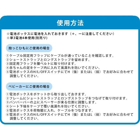 ■抱っこひも ストラップを留め、腰ベルトに固定。赤ちゃんの足をケープ内に入れることで、風を逃さず冷却効率がアップします! ■ベビーカー フレームにストラップを固定し、シート下端を覆うように装着。電池ボックスは荷物籠に収納できるので、見た目もスッキリ。 ※エルゴベビー社以外の抱っこひもの種類によっては、本製品を取り付けできない場合があります。 ※2025/7/2までのレビューは、旧商品(2025年版)のレビューです。 |