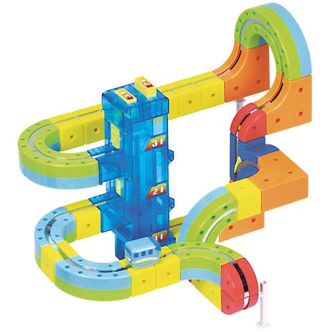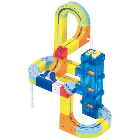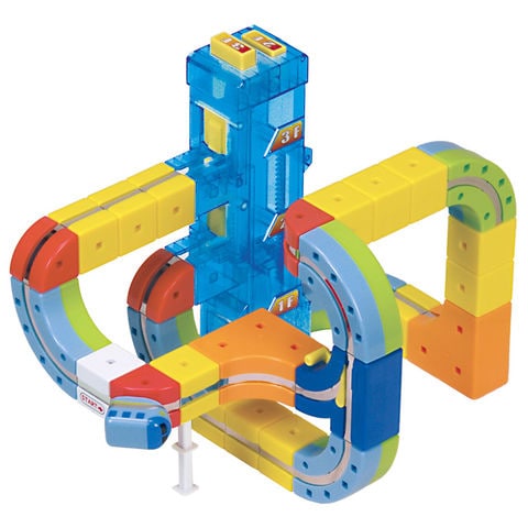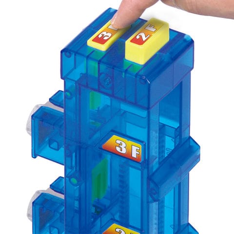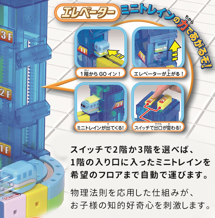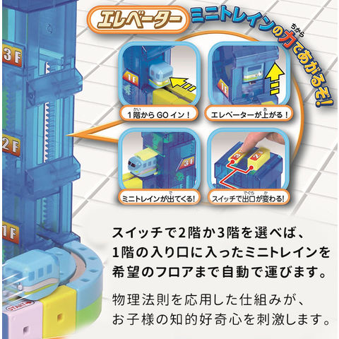 特許出願中の不思議なエレベーターユニット 電池を使わずに動く、驚きのメカニズムを搭載したエレベーターユニットです。スイッチで2階か3階を選べば、1階の入り口に入ったミニトレインを希望のフロアまで自動で運びます。物理法則を応用した仕組みが、お子様の知的好奇心を刺激します。 |
