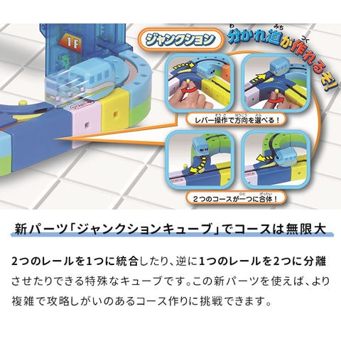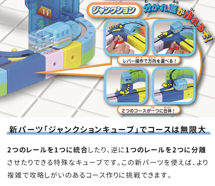 2つのレールを1つに統合したり、逆に1つのレールを2つに分離させたりできる特殊なキューブです。この新パーツを使えば、より複雑で攻略しがいのあるコース作りに挑戦できます。