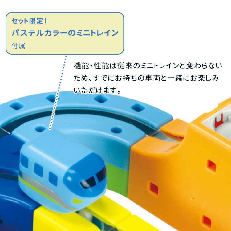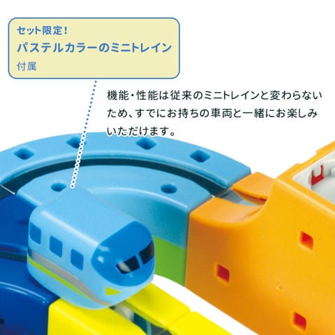 本製品のイメージカラーであるブルーを基調とした、パステル調の「ベビーブルー」のミニトレインが付属します。機能・性能は従来のミニトレインと変わらないため、すでにお持ちの車両と一緒にお楽しみいただけます。