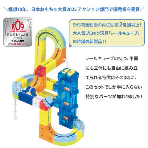 構想10年、日本おもちゃ大賞2025 アクション部門で優秀賞を受賞した「レールキューブ クリアメカ エレベーターセット」がついに登場です! クラウドファンディングでの商品化から瞬く間に人気に火がつき、SNSインフルエンサーによって世界的に話題となったレールキューブ。某海外ストアでも取り扱われるほどデザイン性が高く評価されているこのシリーズに、ユニークな機能を持つ新ユニットが加わりました。 本製品は、ブロック感覚で3次元のコース作成とミニトレインの走行を楽しむための最低限のパーツが揃ったスターターセットと同等のキューブブロック数に加え、画期的な機能を持つ3つの新要素がセットになっています。 |