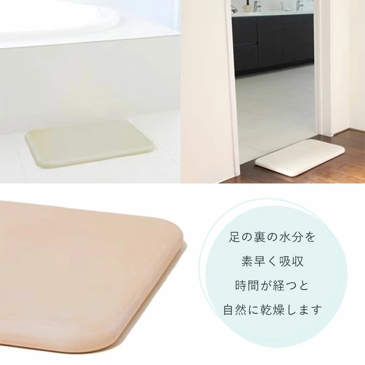 吸水性の高い自然素材、珪藻土(けいそうど)でつくられたバスマットです。足の裏の水分をすばやく吸い取り、時間がたつと自然に乾燥します。自然素材でできていますので安心してお使いいただけます。珪藻土の特徴である無数の微細孔により、毛細管減少が発生し、バスマット表面の水分を一気に吸収します。その水分を水蒸気として放出するため、バスマットは常にサラサラで快適な状態を保ちます。常に乾燥した状態のサラサラ効果が湿度を好むカビやダニの繁殖を防ぎます。タオル系バスマットのような繊維毛がないため、ダニが潜む場所がありません。
