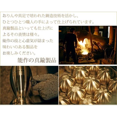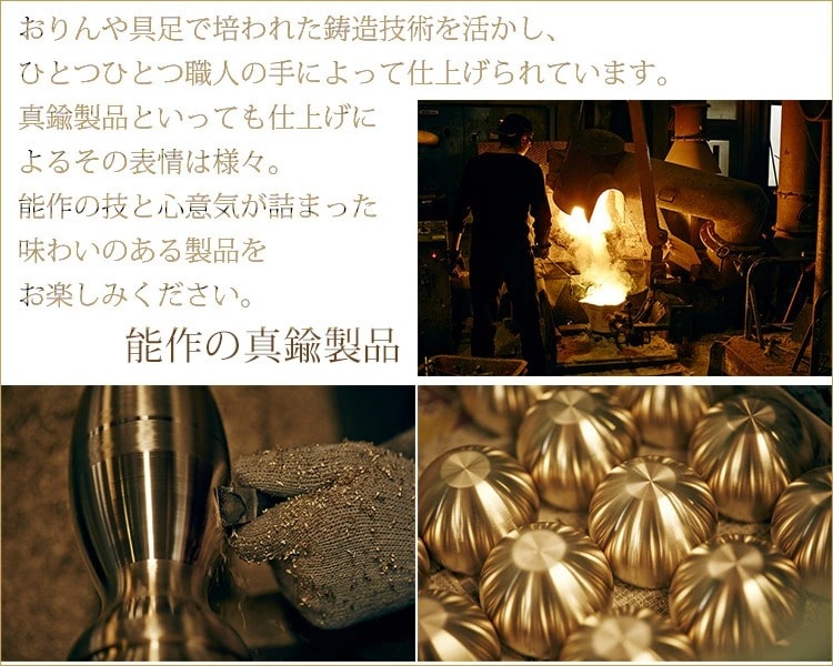 真鍮とは、銅と亜鉛の合金です。紀元前1000年頃から用いられ、古代ローマ帝国では貨幣として使用されました。日本でも正倉院に奈良時代、中国から輸入された真鍮製品が納められています。 現在では、いちばん身近なものでは貨幣の5円玉、そのほか小物、インテリア、建築金物、仏具や楽器の材料としても愛されています。 能作の風鈴やそろり、燭台も真鍮製です。 おりんや具足で培われた鋳造技術を活かし、ひとつひとつ職人の手によって仕上げられています。 真鍮製品といっても仕上げによるその表情は様々。能作の技と心意気が詰まった味わいのある製品を、お楽しみください。 |