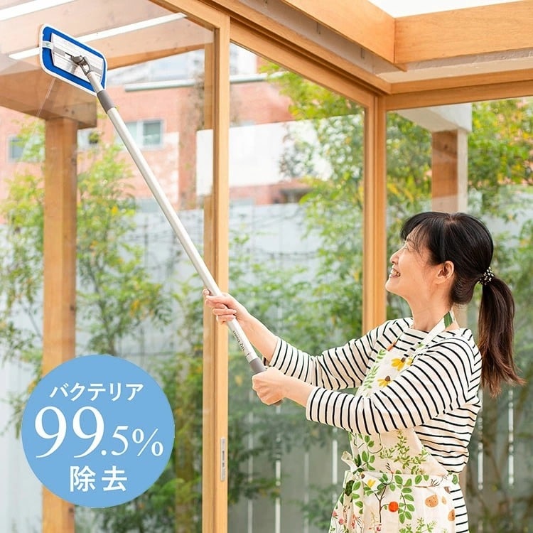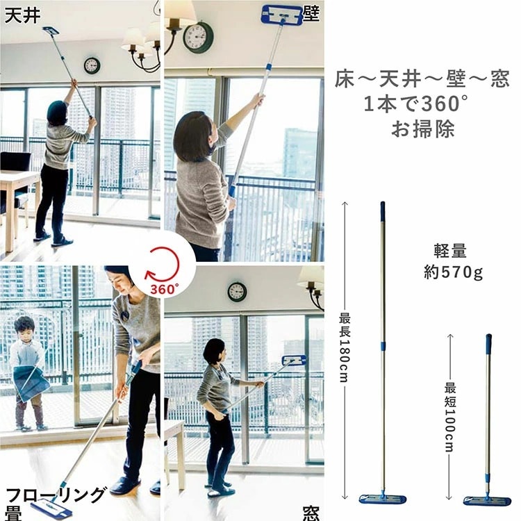 床?窓?壁?天井と、1本で360度、家中の空間がお掃除できる優れモノです。モップクロスは表面も中綿もすべて上質マイクロファイバー100%。だから、吸水力も拭き取り力も抜群!病院清掃にも採用されているクオリティは、オートクレーブ(高圧蒸気滅菌器)で滅菌消毒できる耐熱性にも優れています。