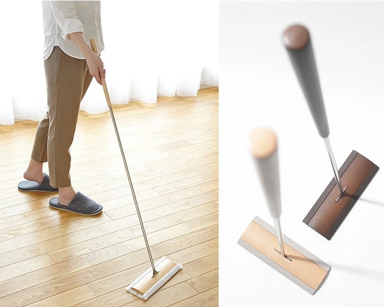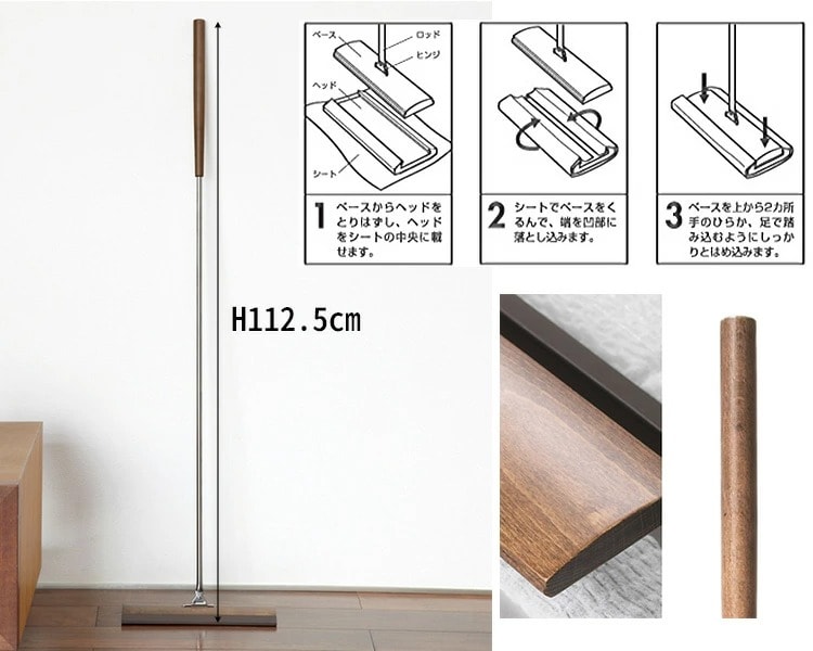 普段よく使うモノだからこそ、どこかに閉まっておくのではなく、生活空間に置いておきたい。 floorwipeはそんなコンセプト対応した、インテリアのイメージを崩すことなく、自然に溶け込むデザインになっています。 グリップとヘッドには高級感あふれる天然木を使用。手になじみ、天然木の適度な重さがあり、力を入れずにスムーズに掃除できます。 ワイパーをフラットにすることで家具の下などの狭いところにも約3cmの隙間まで入り込むことができます。 シートをゴム部分に織り込んで、 上から天然木のヘッド部分を押し込むと簡単にセットできますので、指先をワイパーに挟まず、爪を傷めません。 市販のワイパー用シート(ヘッドサイズ:95mm×260mm用)が使用できます。 |