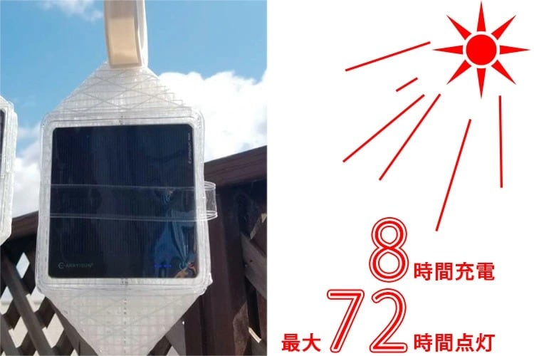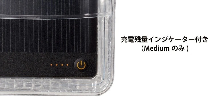 8時間直射日光に当てるだけでフル充電(条件によって変動)! いざという時に電池が無くても最大72時間点灯可能! (弱)約10ルーメン、(中)約20ルーメン、(強)約100ルーメンの点灯モードを備え、防水仕様のため多少の雨にもしっかり耐える! ミディアムサイズには電池残量が一目で分かるインジケーター付き! |