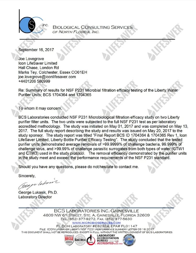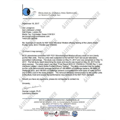 ■強力な除去能力 LIFESAVER LIBERTY(ライフセーバーリバティ)はUltra-Filtrationフィルターを採用することによりほぼ全ての細菌とウィルスを除去することが可能! 細菌・ウィルス、シストの除去率は 細菌低減率 -99.9999% ウィルス低減率-99.999% シスト低減率-99.99% にも及び、独立機関である米国BCS研究所によって検査され、水に関する認証機関として世界で一番厳しいとされるNSFのP231微生物浄水規格に適合していると認められました。。 ![]() ![]() ■独自のデュアル機構を持つインラインポンプ LIFESAVER LIBERTY(ライフセーバーリバティ)独自のデュアル機構を持つインラインポンプを内蔵。付属のスカベンジャーホースを使用するインラインポンプモードでは水源から直接給水することが可能で、非常に幅広い用途で活躍してくれます。 ![]() ■フェイルセーフ・テクノロジー LIFESAVER LIBERTY(ライフセーバーリバティ)はフィルターが寿命に達すると自動的に通水を停止する「フェイルセーフ・テクノロジー」を搭載。 フィルターの限界に気付かず濾過されていない汚水を飲んでしまうようなリスクを避けることが出来ます。 ![]() ■英国軍採用 LIFESAVERは2010年から約10年に渡って継続的に英国陸軍で採用され続けています。長年に渡って使用されていることがLifeSaverの信頼の証です。 |
