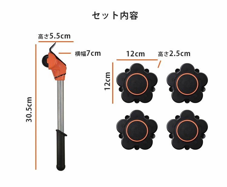 | 仕様 | ■セット内容:持ち上げ棒1本、360台車4台、取扱説明(化粧箱に記載) ■耐荷重:300kg(4台使用時) |