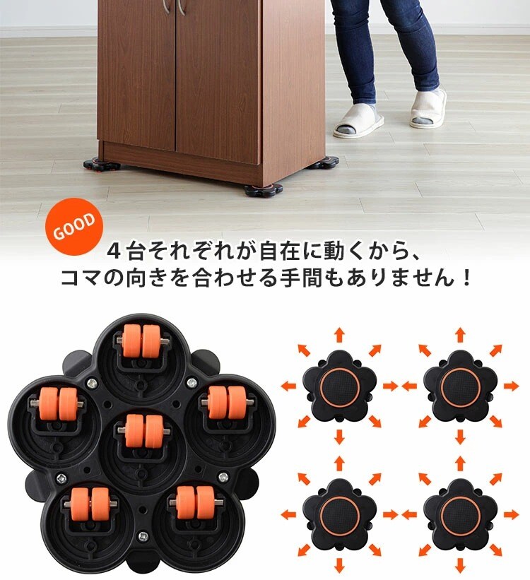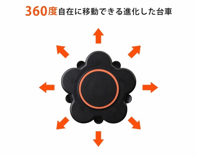 1方向移動だけでなく、前後左右360度自在に移動できる進化した台車。台車を設置するときに4台の向きを合わせる必要もありません。 約2.5cmの薄さで、家具を高く持ち上げなくても安全に設置できます。 耐荷重は300kg(4台使用時)なので、家庭にあるほとんどの家具が移動できます。 ●模様替えなどの家具の移動 ●宅配の重い荷物などの移動 ●引っ越し準備 ●家具裏までしっかり掃除する大掃除 |