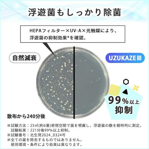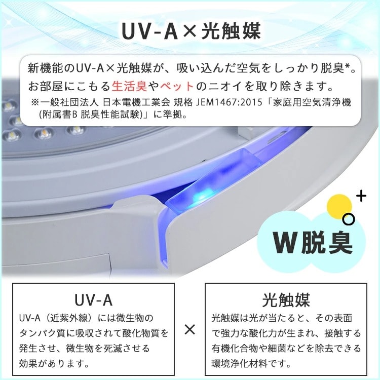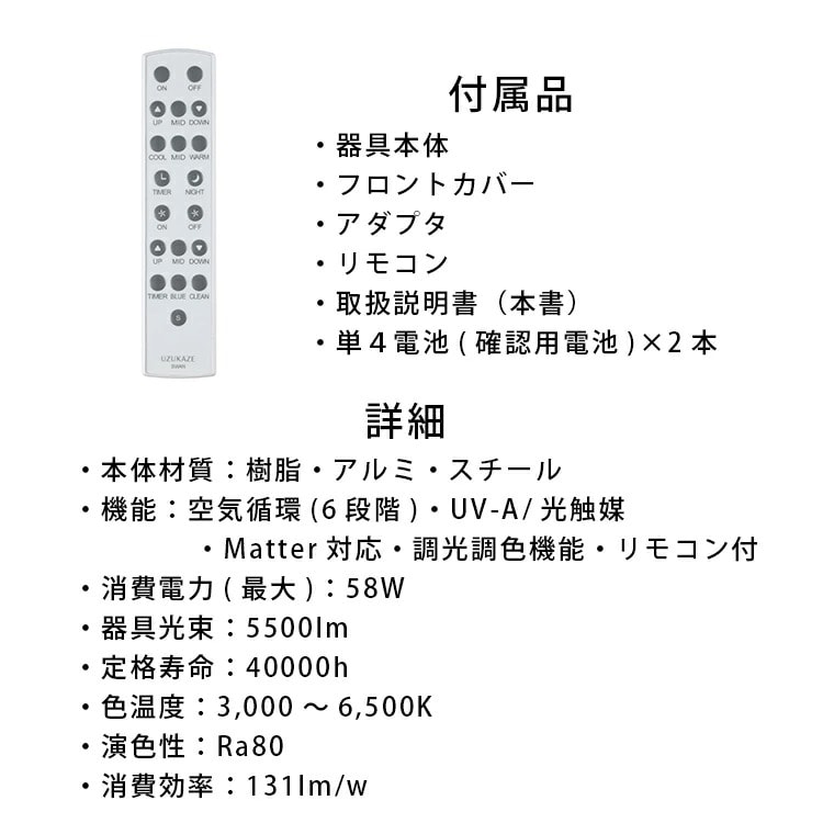 人気の「UZUKAZE」シリーズがさらに進化。 羽のない安心設計で、風をお部屋全体にやさしく循環させながら、空気の除菌・脱臭・清浄を同時に実現。 新搭載のUV-A×光触媒と大型HEPAフィルターで、生活臭やペットのニオイ、浮遊菌をパワフルに対策。 LED照明も高性能で、明るく快適な空間をつくります。 スマートホーム規格「matter」にも対応した、最新モデルです。 |