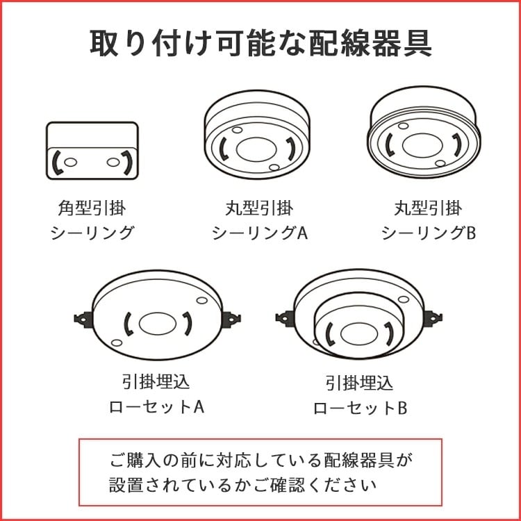 ※表示された電源電圧(AC100V),周波数(50/60Hz)以外で使用しな いでください。 ※本製品をご使用中に、ラジオ等の音響機器への雑音や、他の家電製品の赤外線リモコンが作動しない場合がごくまれにあります。この場合、トラブルが発生しなくなる距離まで離してご使用ください。 ※調光器(ライトコントロール)との併用は出来ません。チラツキ、立ち消え等の点灯不良や調光器、照明器具の故障の原因になります。 ※この器具は天井取付専用器具です。天井面が平らであることをお確かめください。下記のような天井に取り付けますと器具がガタついたり、簡単に回転して取り付けが不十分となり、火災・感電・落下の原因となります。 【取付禁止天井】 船底天井・格子天井・竿縁天井・傾斜天井・その他に凹凸のある天井には取り付けないでください。 ※適合する配線器具を確認してください。付いていない場合は、工事店・電気店に依頼して取り付けてください。配線器具などの取付工事は、電気工事有資格者による施工が義務付けられています。 ※商品の色はモニターの具合で実物と若干異なる場合がございます。予めご了承下さい。 ※デザイン、仕様等につきましては、予告なく変更する場合がございます。予めご了承下さい。 ※ご予約・お取り寄せ商品は、ご注文受付後にお客様ご注文分としてメーカーへ発注を致します為、基本的にキャンセルやご返品はお受けできません。 ※複数店舗を運営しておりますため、ご注文の入れ違い等で欠品などになってしまう場合がございます。万が一、発送が遅れる場合は、ご注文受付当日中にご案内差し上げます。誠に恐れ入りますがご了承くださいますよう、お願い申し上げます。 | |