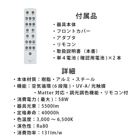 | セット内容・構成品 | ・器具本体 ・フロントカバー ・アダプタ ・リモコン ・取扱説明書 ・単4電池(確認用電池)×2本 |