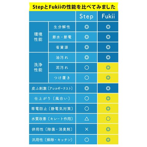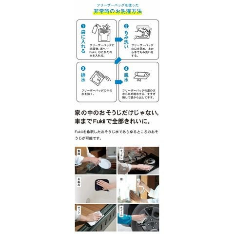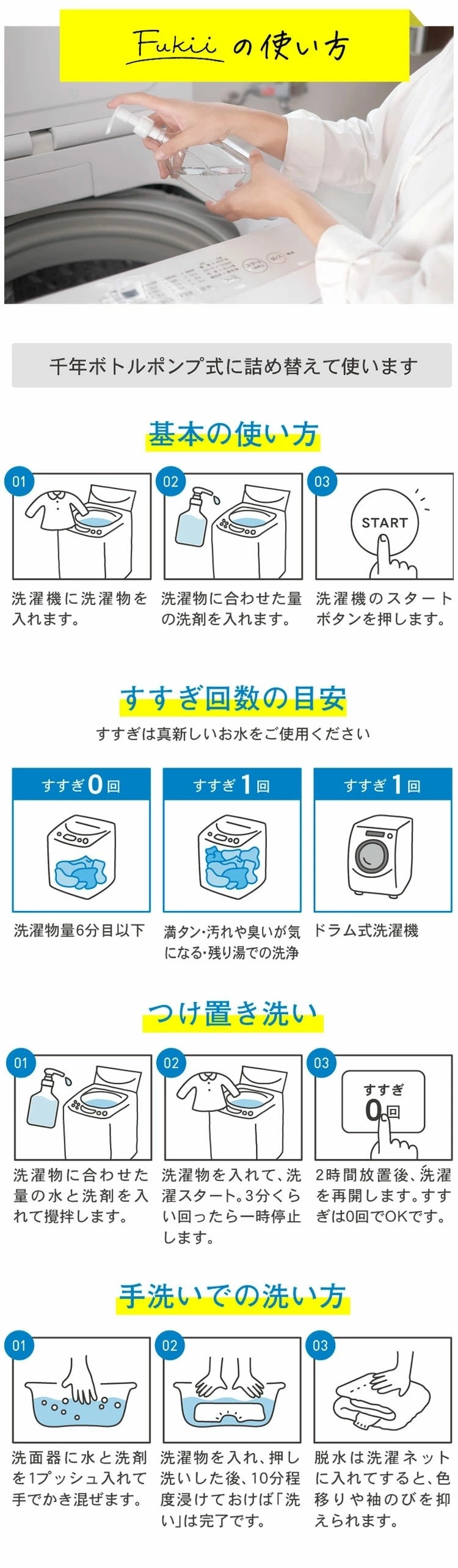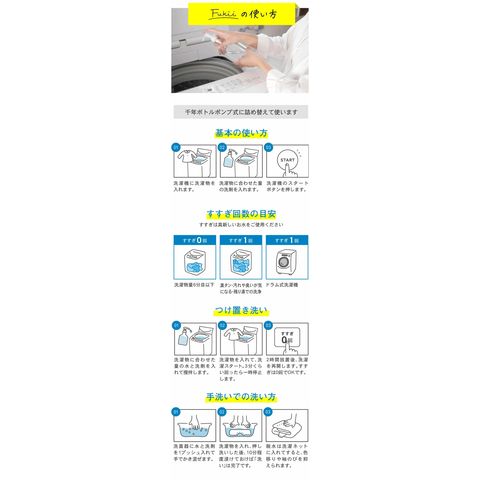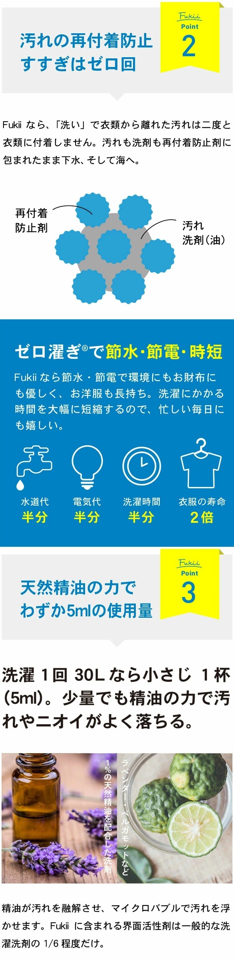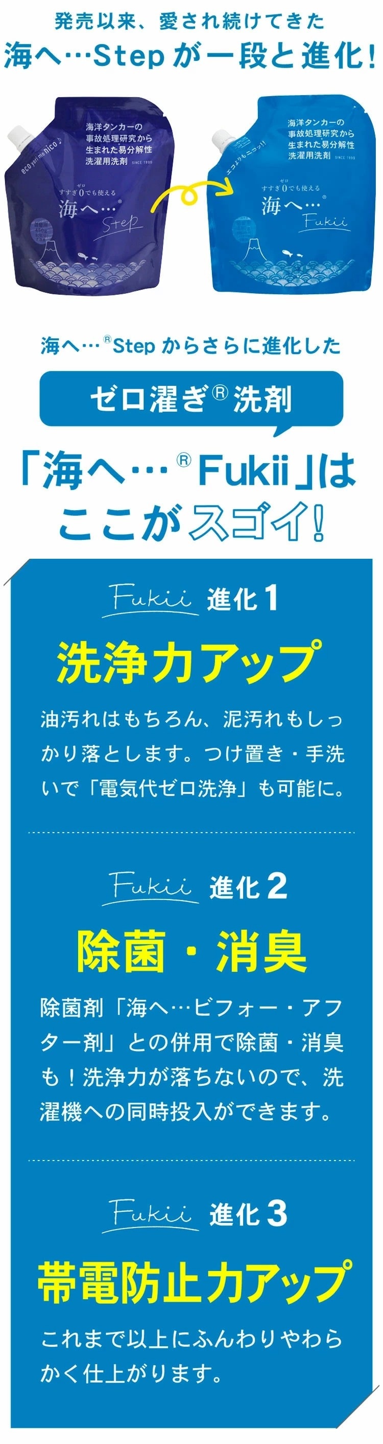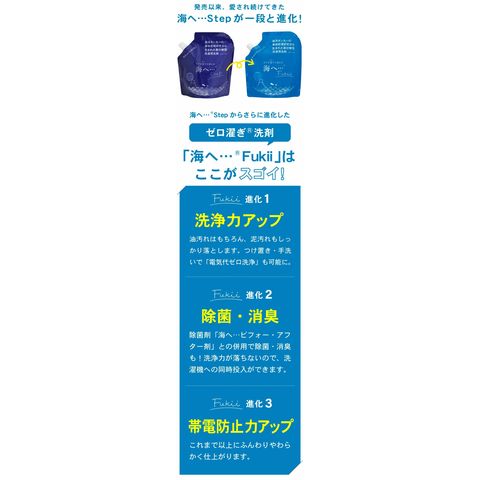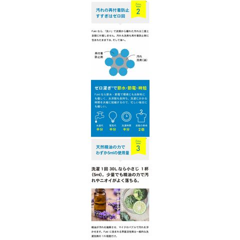 進化1:洗浄力がアップして「電気代ゼロ洗浄」ができます。 つけ置き後に軽く揉んで脱水すれば、洗濯機の力を借りずに汚れを落とせます。 進化2:洗浄力がアップして「泥汚れ」にも強くなりました。 スポーツ着など、汚れのひどいものを濃い目の洗浄液に浸け置きにしたのち、通常濃度にして普通汚れのものを一緒に洗うこともできます。汚れが再付着する心配がありません。 進化3:仕上がりのやわらかさが一段とアップしました。 繊維一本一本が立ち上がり、ふんわり仕上がるから柔軟剤は不要です。 進化4:BeforeAfter剤と併用し、除菌・抗菌も一度にできます。 水に海へ…Fukiiと同量のBeforeAfter剤を入れた洗浄液に浸け置き洗濯すれば、衣服の菌増殖予防と洗濯槽の抗菌ができます。 |