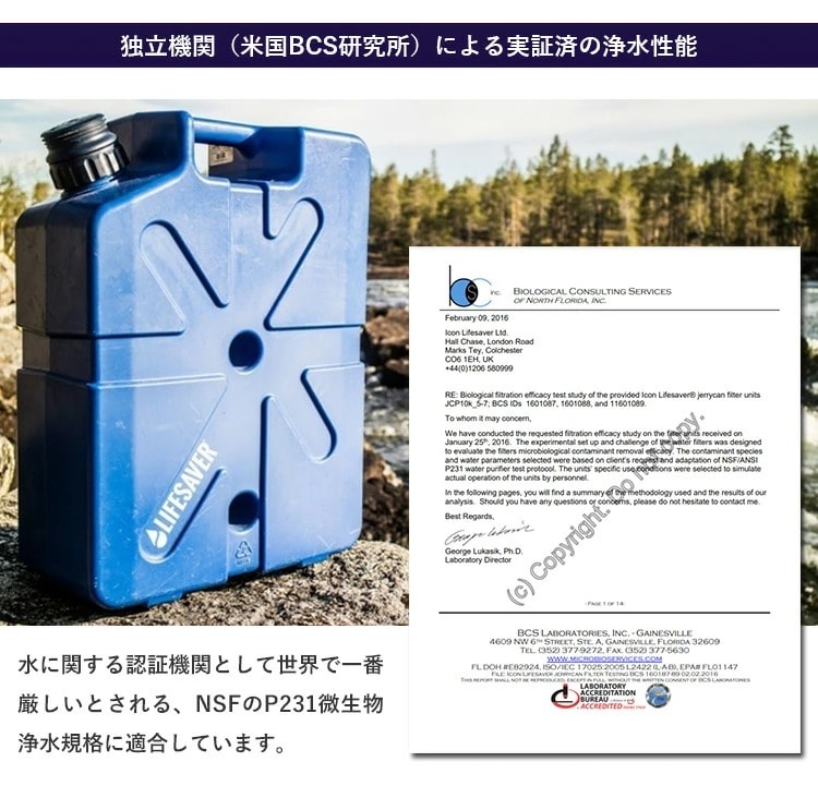 全てのLifeSave製品は、水に関する認証機関として世界で一番厳しいとされる、NSFのP231微生物浄水規格に適合しています。
