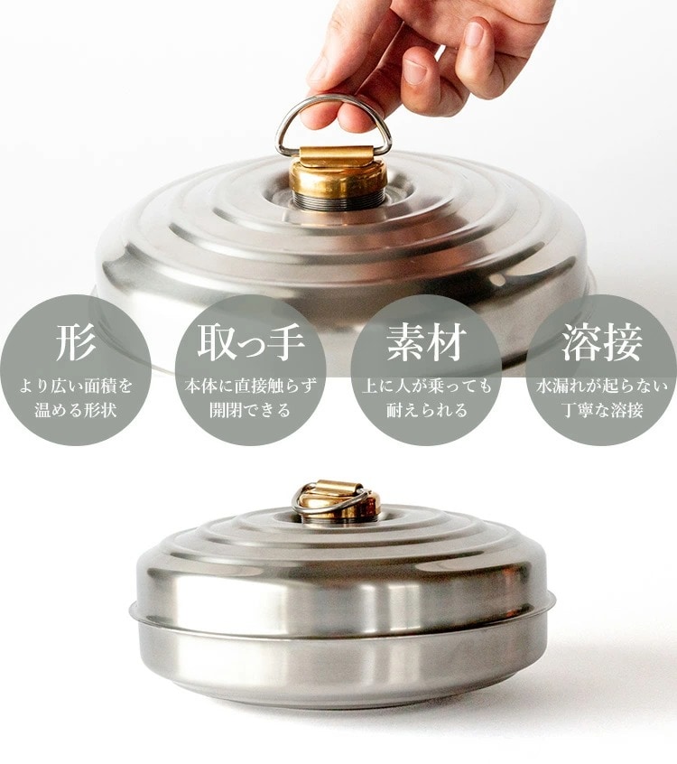 カタチ、素材選びから「長く使える」を徹底的に考えた湯たんぽです。 〇カタチ どらやきのような可愛い形は、中に入れたお湯の熱をより広い面積に伝えるためのもの、置くときにもしっかりと安定して、体や布団に温かさを届けてくれます。 表面の凹凸は、本体の表面積を大きくして熱効率をよくするための工夫で、上に人が乗っても耐えられるほど丈夫な構造体にするためにも一役買っていたりします。 〇取っ手 取っ手付きのフタだから、熱湯を注ぐ本体に直接触れずに開閉したり、持ち運びも行えます。 〇丈夫な素材 素材に選んだのはステンレスの中でも特にサビに強い18-8というステンレスで、食器・カトラリーにも多く採用されている長く使える丈夫で強い金属。 〇丁寧なつくり そんなステンレスを長い間使い続けても水漏れが起こらないよう、本体上下のパーツは溶接で丁寧に仕上げました。 |