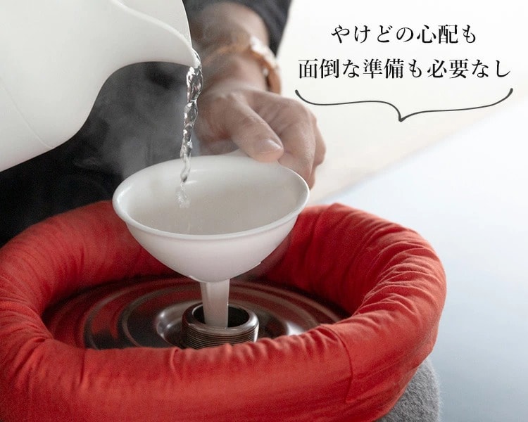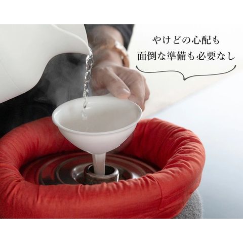 使う時は、本体をカバーに入れたまま付属のロートを使ってお湯を注ぎ、蓋を閉めたら巾着の紐を閉じるだけ。直接熱くなった本体に触らず湯たんぽが作れるので、やけどの心配も面倒な準備も必要ありません。コットン製のライナーについたミニポケットも便利に活用できます。