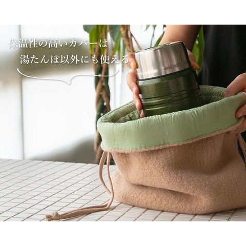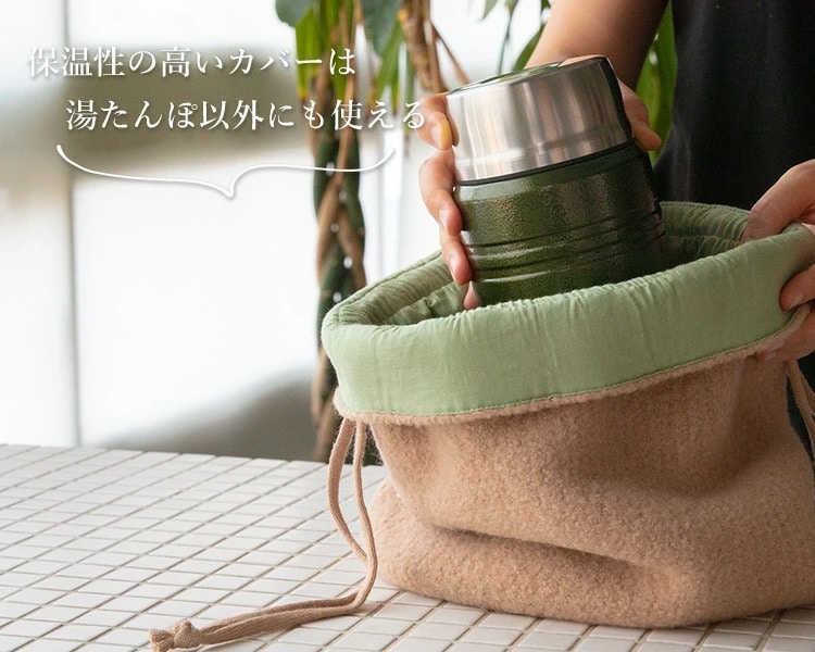本体をカバーにスポッと入れて使うだけ、ウールの層がお湯の温度を心地良い温かさに変換してふんわりと体を温めてくれます。さらにフェルトに包まれることで、温かさが本体そのままと比べてグッと長持ちします。