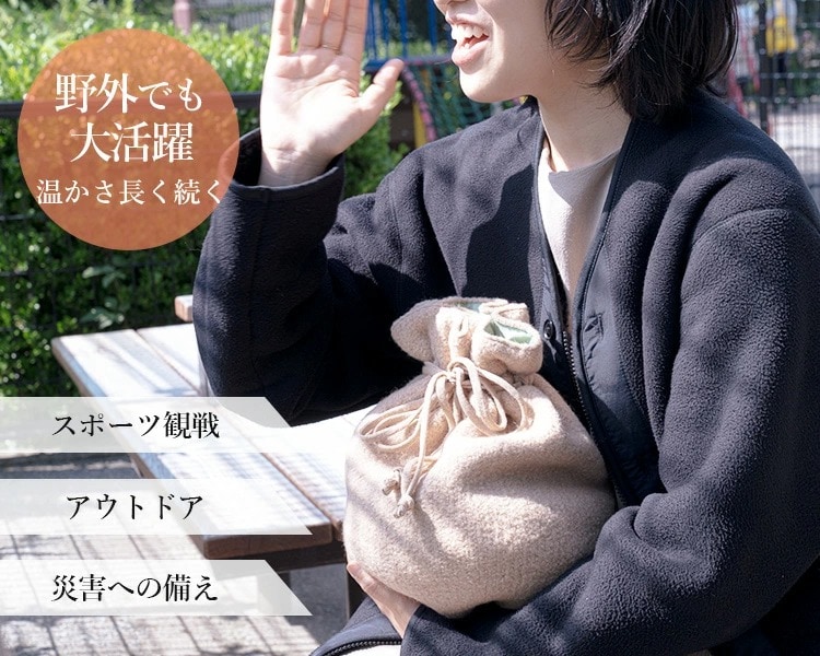 電気の使えない環境でもしっかり温かさが続く「100年湯たんぽ」で温かくお過ごしください。コロンとした形とウールの肌触りで、膝に抱えやすく、アウトドアでの使用にもしっかり耐えられるステンレスの頑丈な作りと、暖かさが長く続くウールの保温性能で、寒さの気になるシーンでも大活躍してくれます。 ◇上のワカサギ釣りなど ◇スポーツ観戦 ◇キャンプ等のアウトドア ◇突然やってくる災害への備え |