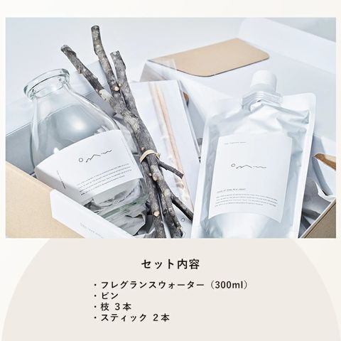 | セット内容・構成品 | ・フレグランスウォーター 300ml(パック入り) ・ビン ・クロモジ、タムシバ、ヒメシャラまたはイヌシデ(アカシデ)の枝 3本 ・コウヤマキ又はタムシバスティック 2本(ストロー状リード) |