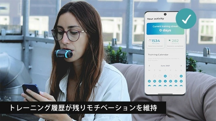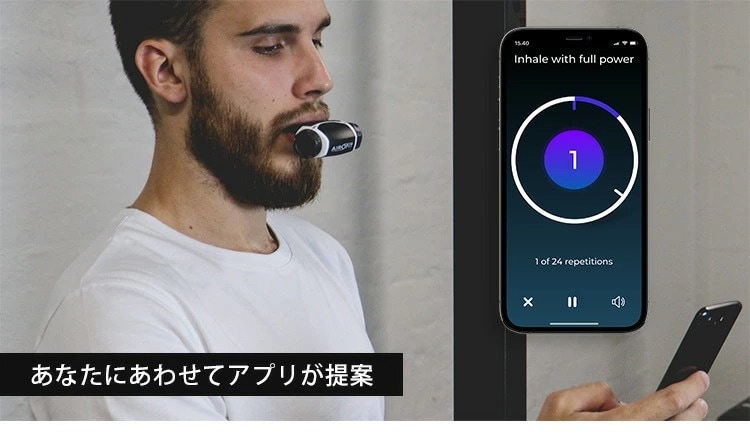 呼吸筋トレーニングは、アスリートだけのものではありません。 階段の上り下りなど日常の生活で息切れしてしまったり、デスクワークなど長時間同じ姿勢をとることで普段の呼吸が浅くなっている方にも、呼吸筋を鍛えることがオススメです。 手のひらサイズで手軽に呼吸筋トレーニングができるのが【エアロフィット】 専用アプリがあなたの目的に応じたトレーニングを提案してくれ、毎日5分から10分程度のワークアウトを6?8週間継続することで呼吸筋が鍛えられます。 エアロフィットの呼吸筋へ負荷を与えるエクササイズは、呼吸筋を鍛えることで、呼吸回数を減らしエネルギーを温存することにつながります。 〇呼吸筋(横隔膜・肋間筋)を鍛え筋持久力を高める 〇肺活量を向上し、深い呼吸を手に入れる 〇お腹周りのインナーマッスルを鍛える |