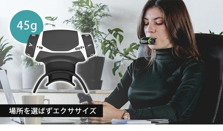 | 呼吸筋を鍛えることで、毎日のコンディションを整え、パフォーマンスを高めます。セットして口にくわえるだけですぐにエクササイズを開始できます。エクササイズは「吸う、吐く、とめる」の単純な3つのアクション。個人のコンディションにあわせて呼吸の「吸う」「吐く」それぞれ6段階の抵抗を調整できます。 |