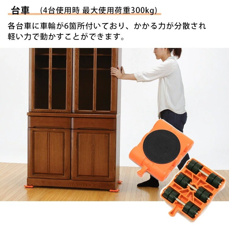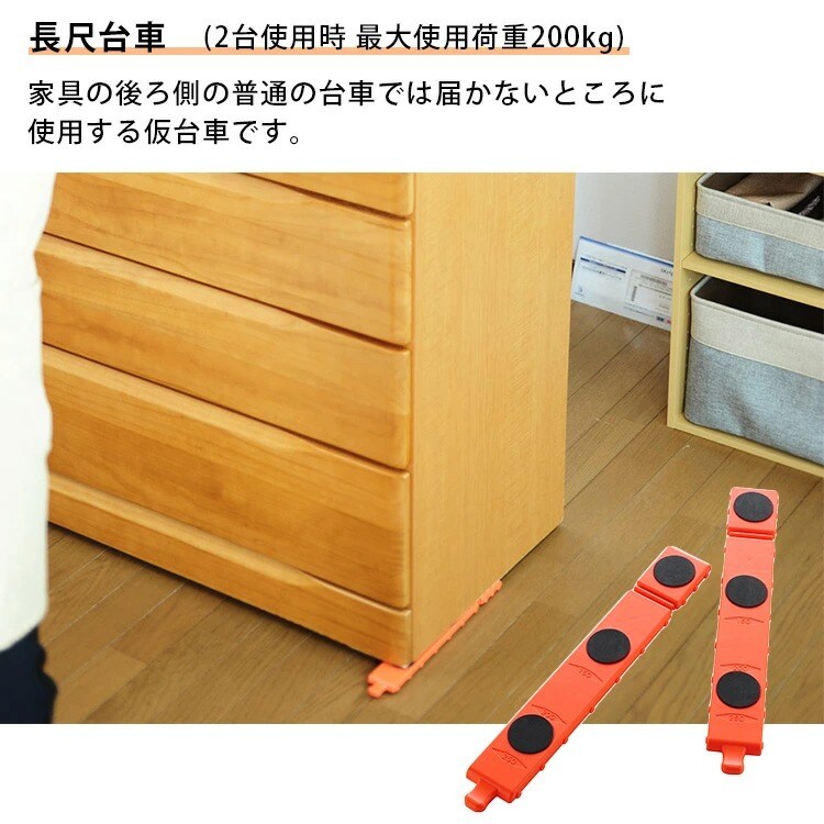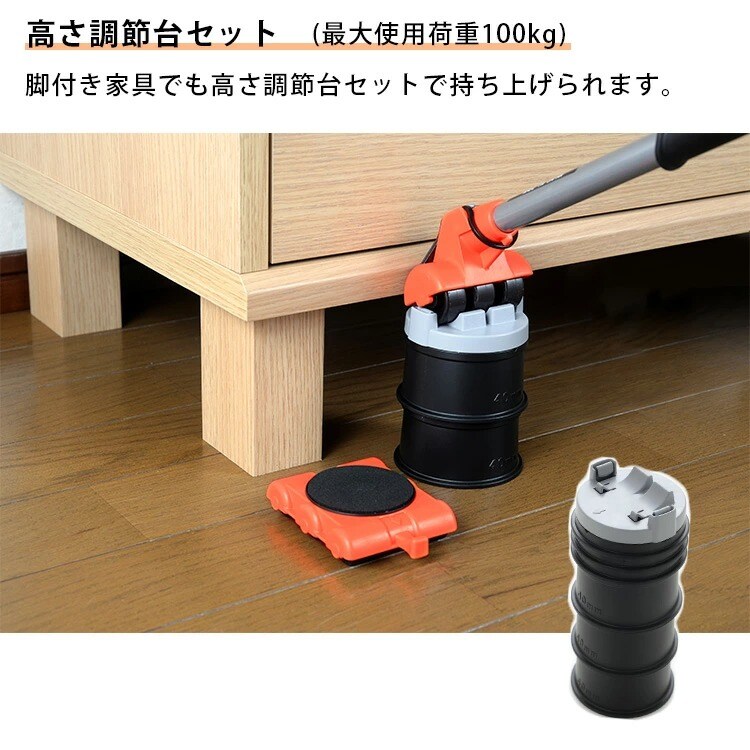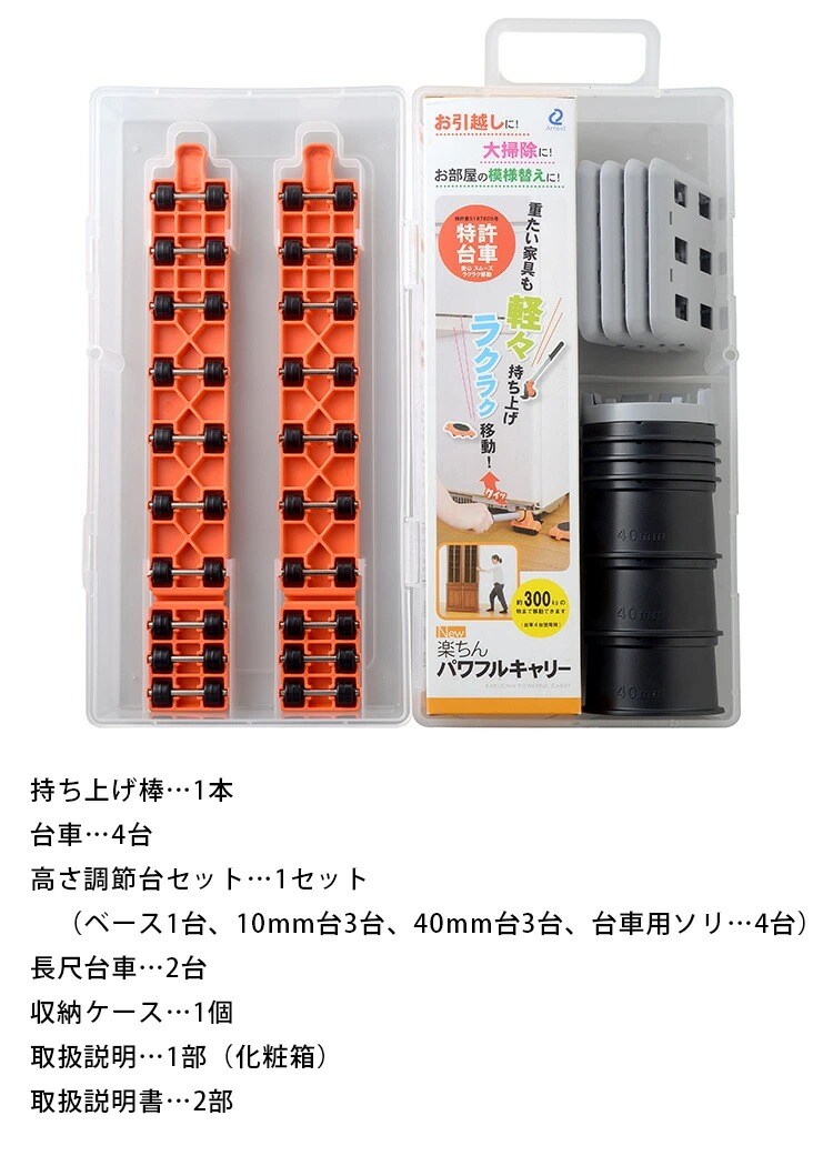 ●持ち上げ棒(最大持ち上げ能力150kg) 重たい家具もテコの原理を利用し、5分の1の力で持ち上げることができます。差し込み部分が先端にかけて薄くなっており、少しのすき間にもしっかり入ります。 ●台車(4台使用時 最大使用荷重300kg) 300kgまでの重たい家具もスイスイ移動することができます。各台車に車輪が6箇所付いており、かかる力が分散され軽い力で動かすことができます。ウレタンクッション付きで家具の底面にフィットし、移動中でもズレにくく段差移動にも強い。 ●長尺台車(2台使用時 最大使用荷重200kg) 家具の後ろ側の普通の台車では届かないところに使用する仮台車です。 ●高さ調節台セット(最大使用荷重100kg) 脚付き家具でも高さ調節台セットで持ち上げられます。持ち上げ棒とベースと台を組み合わせ、10mmから160mmまでの高さに簡単に調節できます。ベースと台と持ち上げ棒はワンタッチでセットでき一体化します。 ●台車用ソリ 台車下部に取り付け、絨毯のような柔らかい床でも、スムーズに走行することができます。 ●収納ケース バラバラになりがちな細かい付属品を一まとめに収納。透明で中身も見えやすく、取っ手付きなので片手で持ち運びも楽ちんです。 |