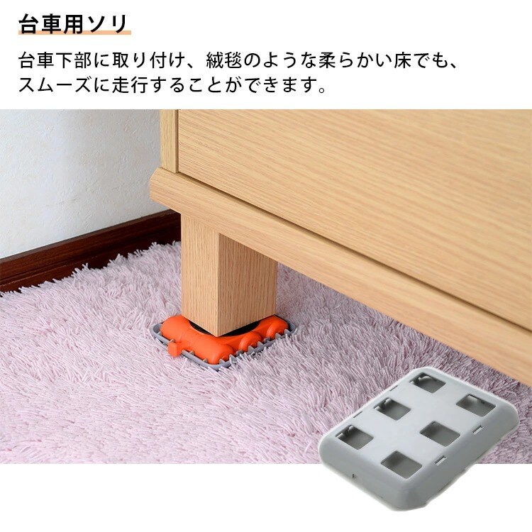 | 材質 | 持ち上げ棒:スチール、ABS樹脂、熱可塑性エラストマー 台車:ABS樹脂、スチール、ウレタン 高さ調節台セット:ABS樹脂 台車用ソリ:ABS樹脂 長尺台車:ABS樹脂、スチール、ウレタン 収納ケース:ポリプロピレン |