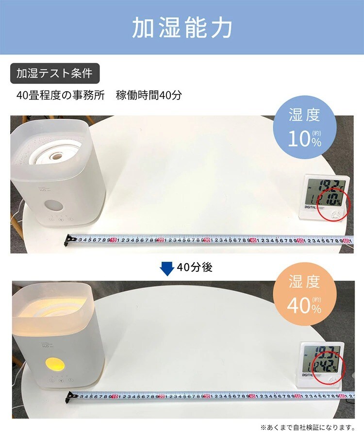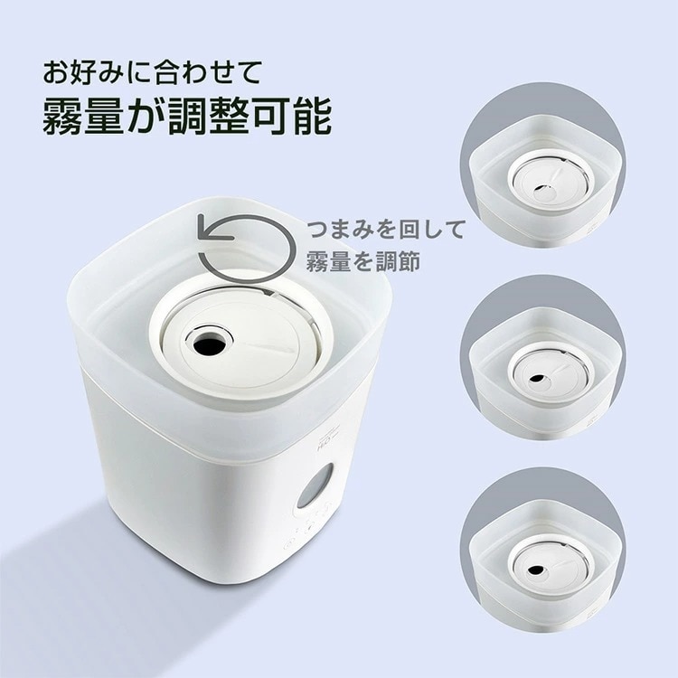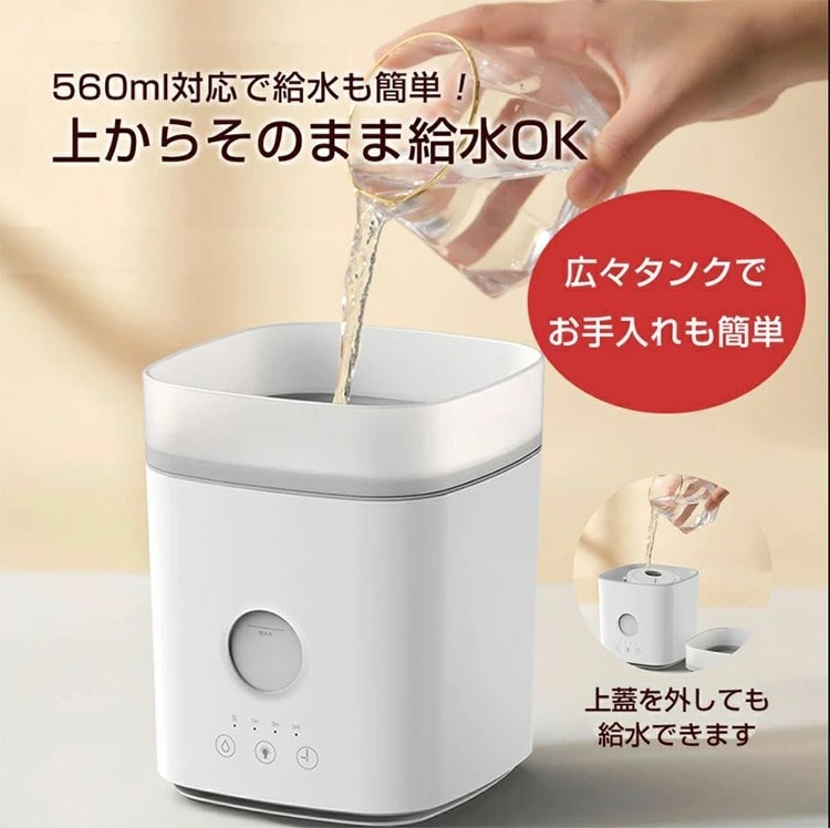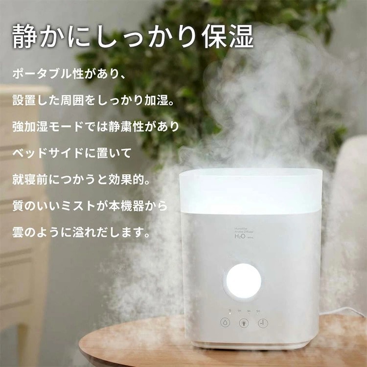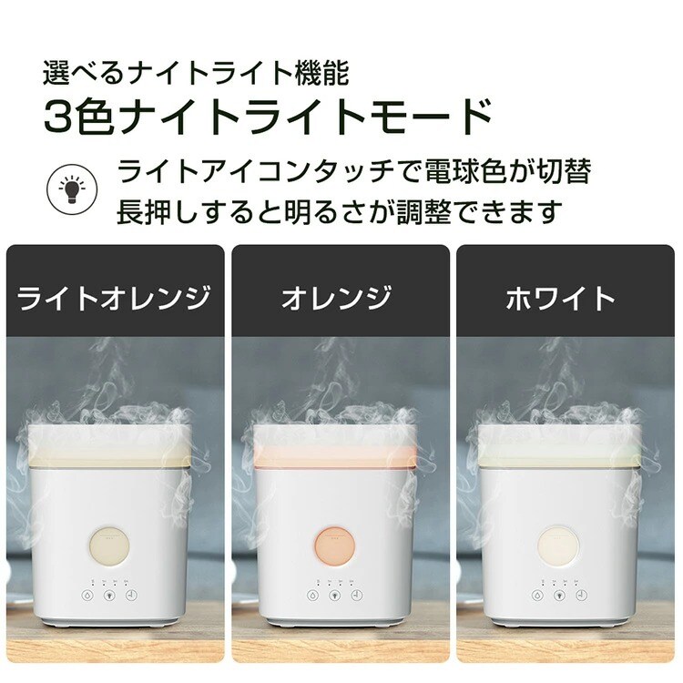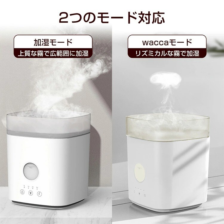 | 仕様 | ■動作モード:連続加湿モード/waccaモード ■連続加湿時間:約8時間 ■電源:AC100V50/60Hz(ACアダプタ:出力DC24V/1.0A) ■タイマー機能:あり(1時間/3時間/5時間) ■ナイトライト:ホワイト/ライトオレンジ/オレンジ ■アロマウォーター:対応 ■エッセンシャルオイル:対応 ■保証期間:1年 |