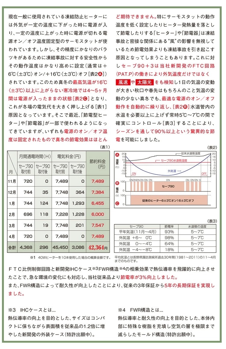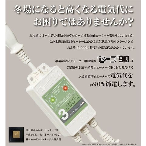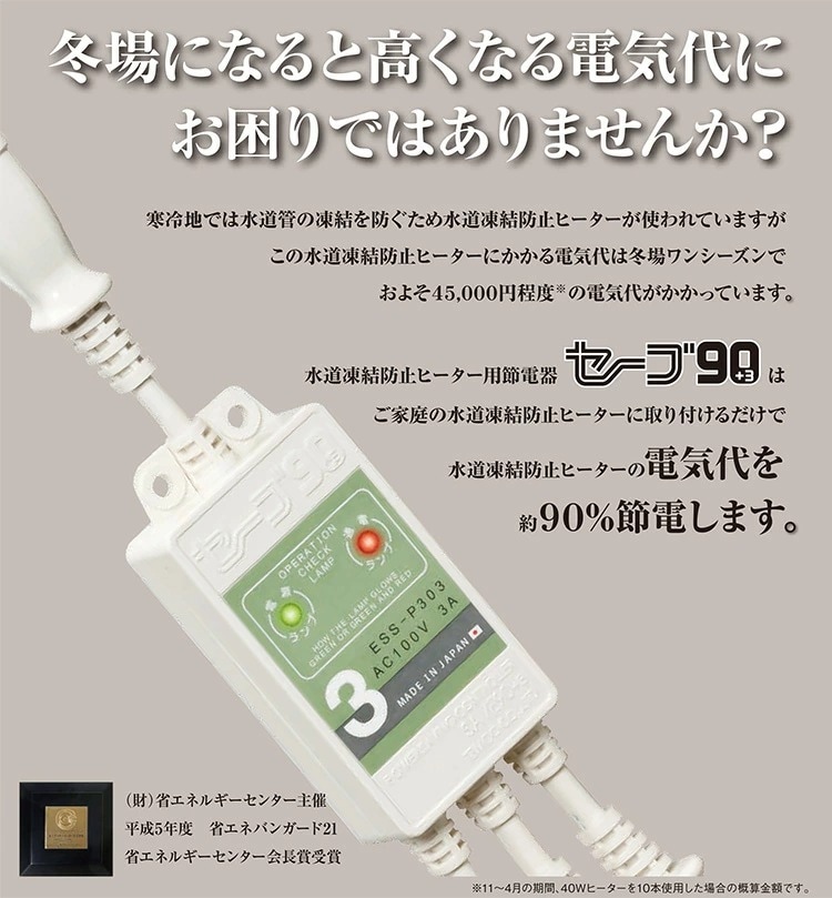 寒冷地では水道管の凍結を防ぐために水道凍結防止ヒーターが使われていますが、この水道凍結防止ヒーターにかかる電気代は冬場ワンシーズンでおよそ45,000円程度の電気代がかかっています。 ※11月?4月の期間、40Wヒーターを10本使用した場合の概算金額です。 30年の経験と実績で培った技術でさらに進化を遂げたセーブ90。 水道凍結防止ヒーター用節電器「セーブ90+3」はご家庭の水道凍結防止ヒーターに取り付けるだけで水道凍結防止ヒーターの電気だを約90%節約します。 特許技術FTC比例制御回路に新開発の3つの技術(ITCケース/FWR構造/O.C/LAMP)をプラスして当社従来品より節電性能・耐久性・扱いやすさが向上しました! ●専門機関にも認められた確かな節電技術。 特許FTC比例制御回路に加えて新開発IHCケースとFWR構造の相乗効果で脅威的な節電を実現。 ※(財)省エネルギーセンター主催 平成5年度省エネバンガード21 省エネルギーセンター会長賞受賞 ●取り付けはとっても簡単。取り付け後はムダな電気代はかからないから一年中接続したままでOK。 本格的に寒くなる前の取り付けが効果的。 |