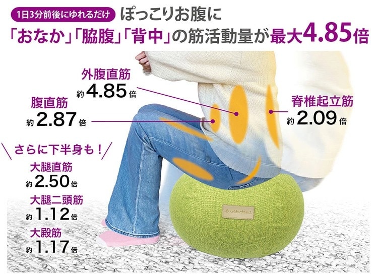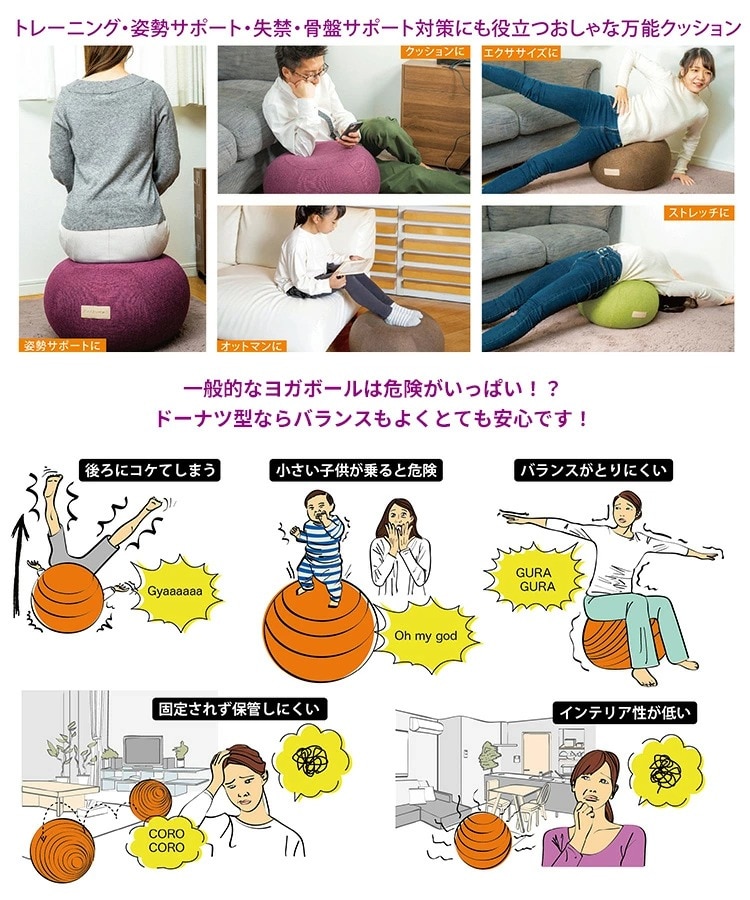 「永く愛用できるものを」 たった1つで様々な運動ができるため、プラスチックや鉄の塊は必要ない。 弾力性の強い素材を使用しているが、転がらない形状のため転倒の可能性を軽減。 「現代人の生活の質を高める」 いつもそばにあるから「ちょっとした時間」にすぐできる! 使わない時だってインテリア性バツグンのプフとしてお部屋を彩ります。 「宅トレのいいとこどり」 柔らかい素材だから体重を預けても痛くない! 転がらずにしっかり安定するのに、全方向に動かすこともできる。 |